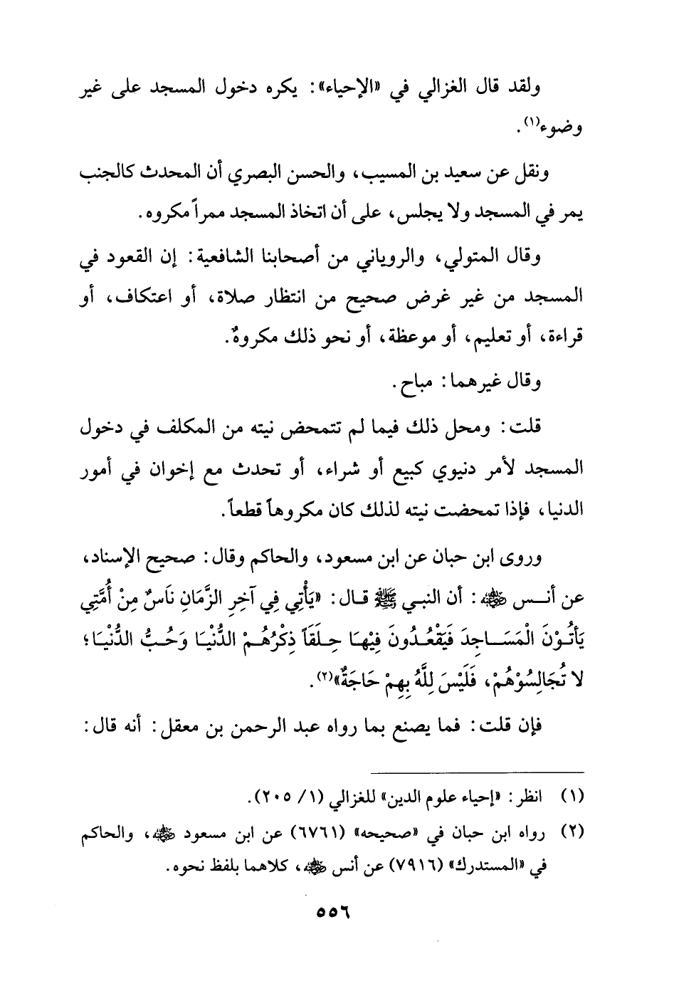 وقال المتولي، والروياني من أصحابنا الشافعية: إن القعود في المسجد من غير غرض صحيح من انتظار صلاة، أو اعتكاف، أو قراءة، أو تعليم، أو موعظة، أو نحو ذلك مكروهٌ.