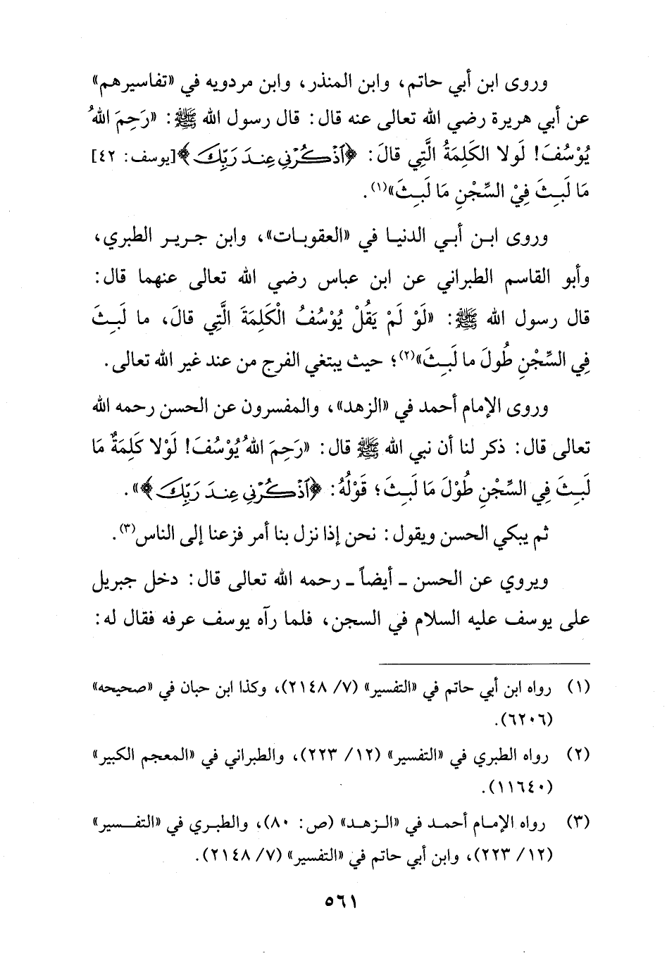 وروى ابن أبي الدنيا في "العقوبات"، وابن جرير الطبري، وأبو القاسم الطبراني عن ابن عباس رضي الله تعالى عنهما قال: قال رسول الله - صلى الله عليه وسلم -: "لَوْ لَمْ يَقُلْ يُوْسُفُ الْكَلِمَةَ الَّتِي قالَ، ما لَبِثَ فِي السِّجْنِ طُولَ ما لَبِثَ" (¬2)؛ حيث يبتغي الفرج من عند غير الله تعالى.