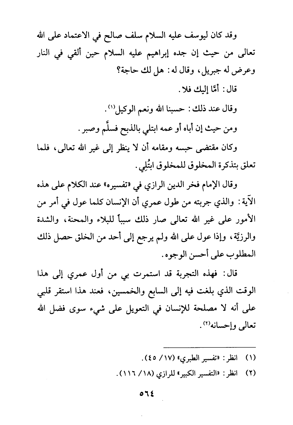 وقال الإمام فخر الدين الرازي في "تفسيره" عند الكلام على هذه الآية: والذي جربته من طول عمري أن الإنسان كلما عول في أمر من الأمور على غير الله تعالى صار ذلك سبباً للبلاء والمحنة، والشدة والرزيَّة، وإذا عول على الله ولم يرجع إلى أحد من الخلق حصل ذلك المطلوب على أحسن الوجوه.