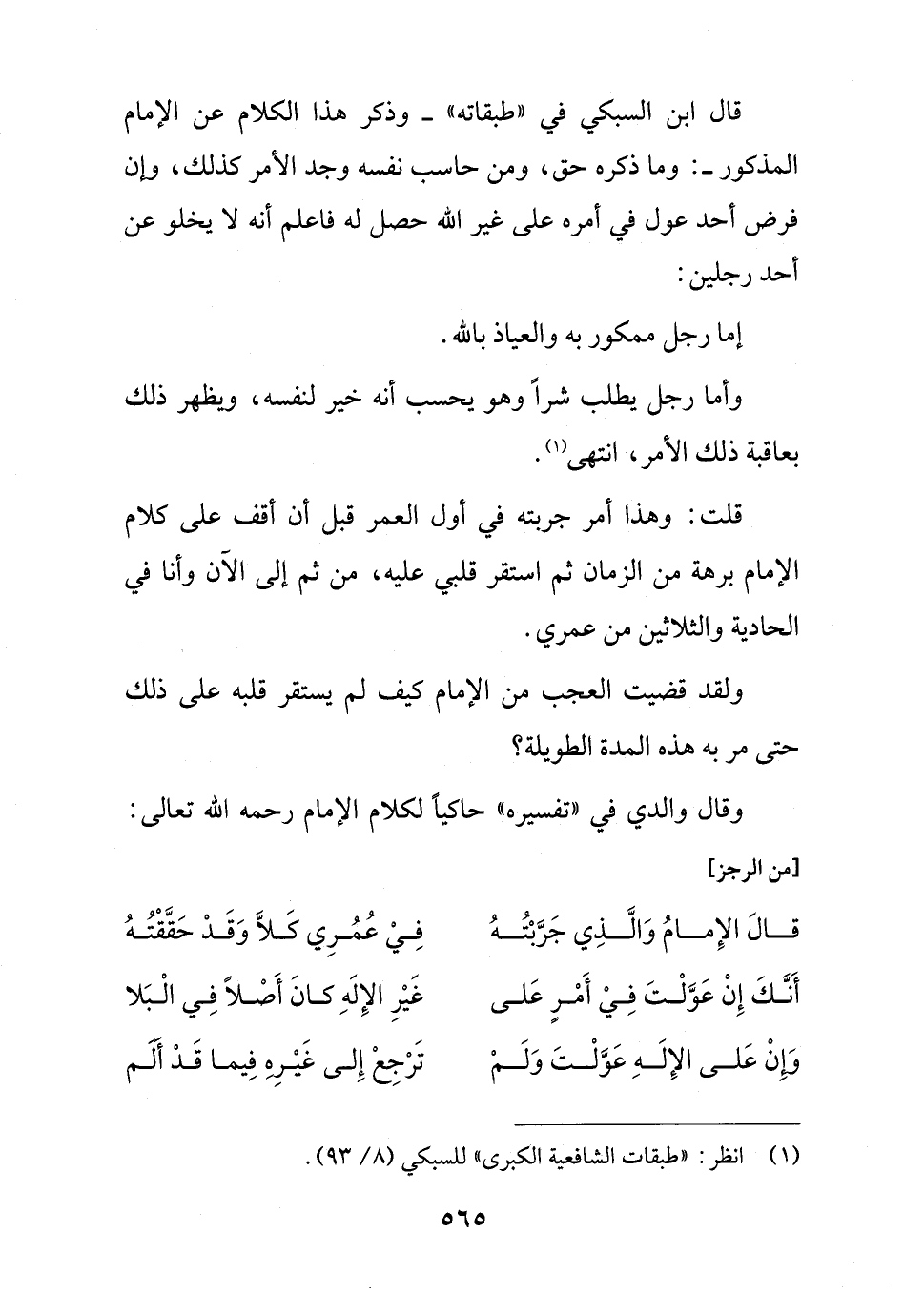 قال ابن السبكي في "طبقاته" -وذكر هذا الكلام عن الإمام المذكور-: وما ذكره حق، ومن حاسب نفسه وجد الأمر كذلك، وإن فرض أحد عول في أمره على غير الله حصل له فاعلم أنه لا يخلو عن أحد رجلين: