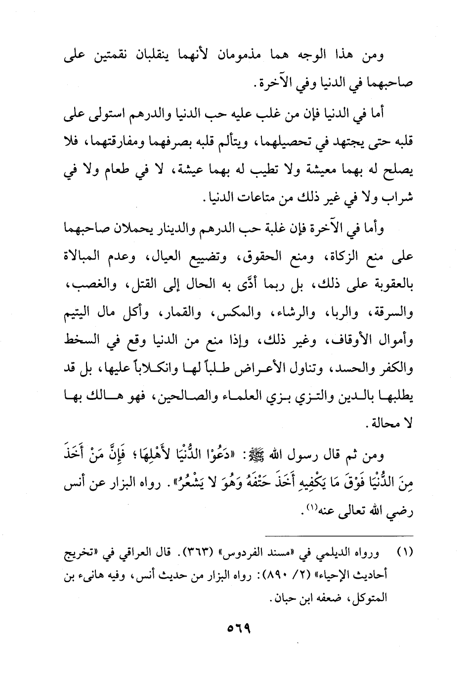 وأما في الآخرة فإن غلبة حب الدرهم والدينار يحملان صاحبهما على منع الزكاة، ومنع الحقوق، وتضييع العيال، وعدم المبالاة بالعقوبة على ذلك، بل ربما أدَّى به الحال إلى القتل، والغصب، والسرقة، والربا، والرشاء، والمكس، والقمار، وأكل مال اليتيم وأموال الأوقاف، وغير ذلك، وإذا منع من الدنيا وقع في السخط والكفر والحسد، وتناول الأعراض طلباً لها وانكلابًا عليها، بل قد يطلبها بالدين والتزي بزي العلماء والصالحين، فهو هالك بها لا محالة.