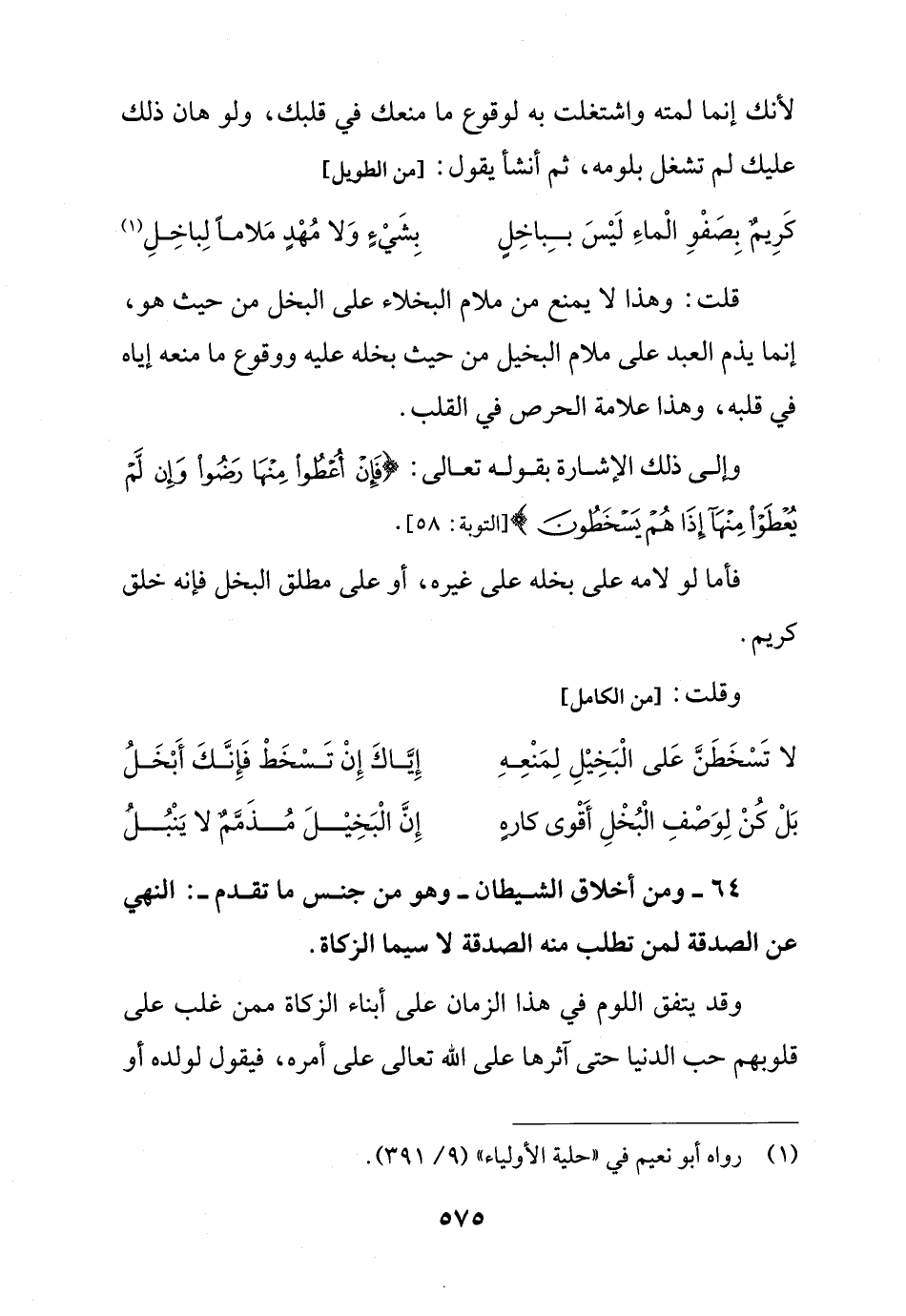 قلت: وهذا لا يمنع من ملام البخلاء على البخل من حيث هو، إنما يذم العبد على ملام البخيل من حيث بخله عليه ووقوع ما منعه إياه في قلبه، وهذا علامة الحرص في القلب.