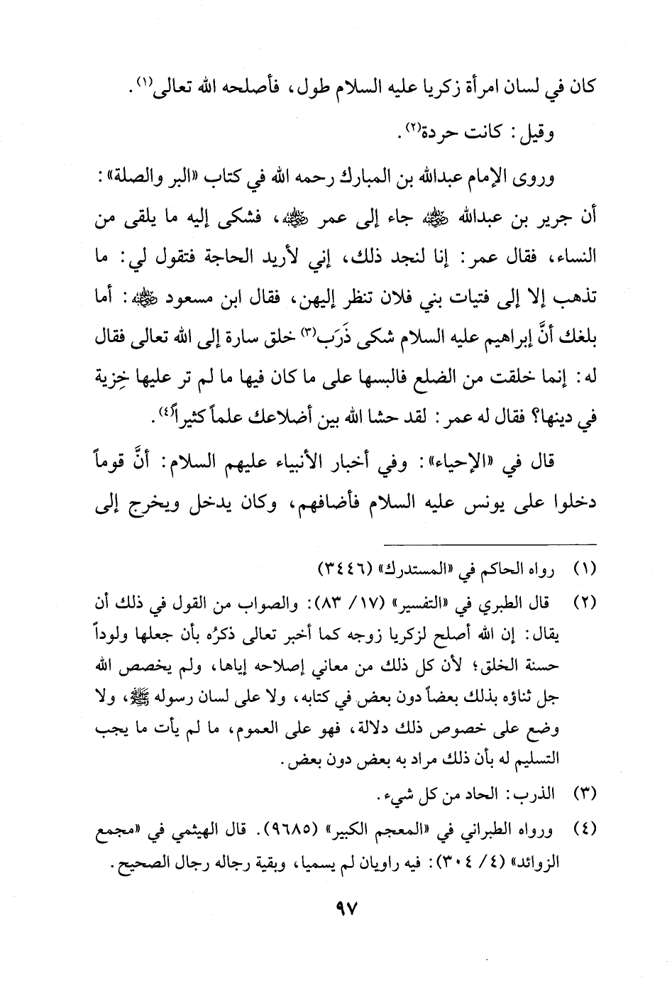 كان في لسان امرأة زكريا عليه السلام طول، فأصلحه الله تعالى (¬1).