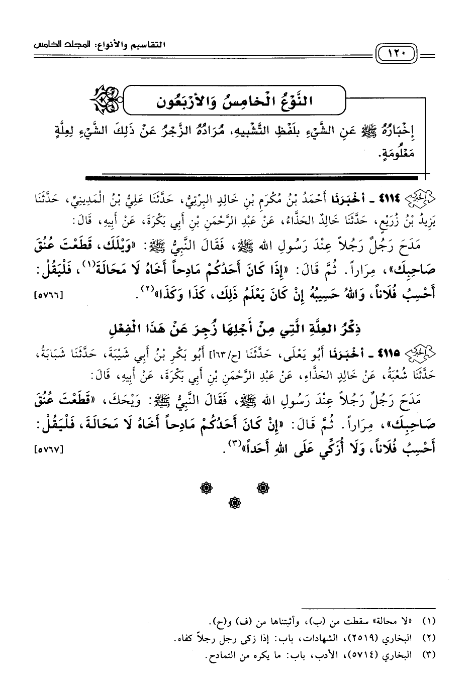 ٤١١٤ - أَخبَرنا أَحْمَدُ بْنُ مُكْرَمِ بْنِ خَالِدٍ الْبِرْتِيُّ، حَدثنا عَلِيُّ بْنُ الْمَدِينِيِّ، حَدثنا يَزِيدُ بْنُ زُرَيْعٍ، حَدثنا خَالِدٌ الْحَذَّاءُ، عَنْ عَبْدِ الرَّحْمَنِ بْنِ أَبِي بَكْرَةَ، عَنْ أَبِيهِ، قَالَ: مَدَحَ رَجُلٌ رَجُلاً عِنْدَ رَسُولِ اللهِ صَلى الله عَلَيه وسَلم، فَقَالَ النَّبِيُّ صَلى الله عَلَيه وسَلم: "وَيْلَكَ، قَطَعْتَ عُنُقَ صَاحِبِكَ" مِرَارًا، ثُمَّ قَالَ: "إِذَا كَانَ أَحَدُكُمْ مَادِحًا أَخَاهُ لا محالة، فَلْيَقُلْ: أَحْسِبُ فُلَانًا، وَاللهُ حَسِيبُهُ إِنْ كَانَ يَعْلَمُ ذَلِكَ، كَذَا وَكَذَا". [٥٧٦٦]