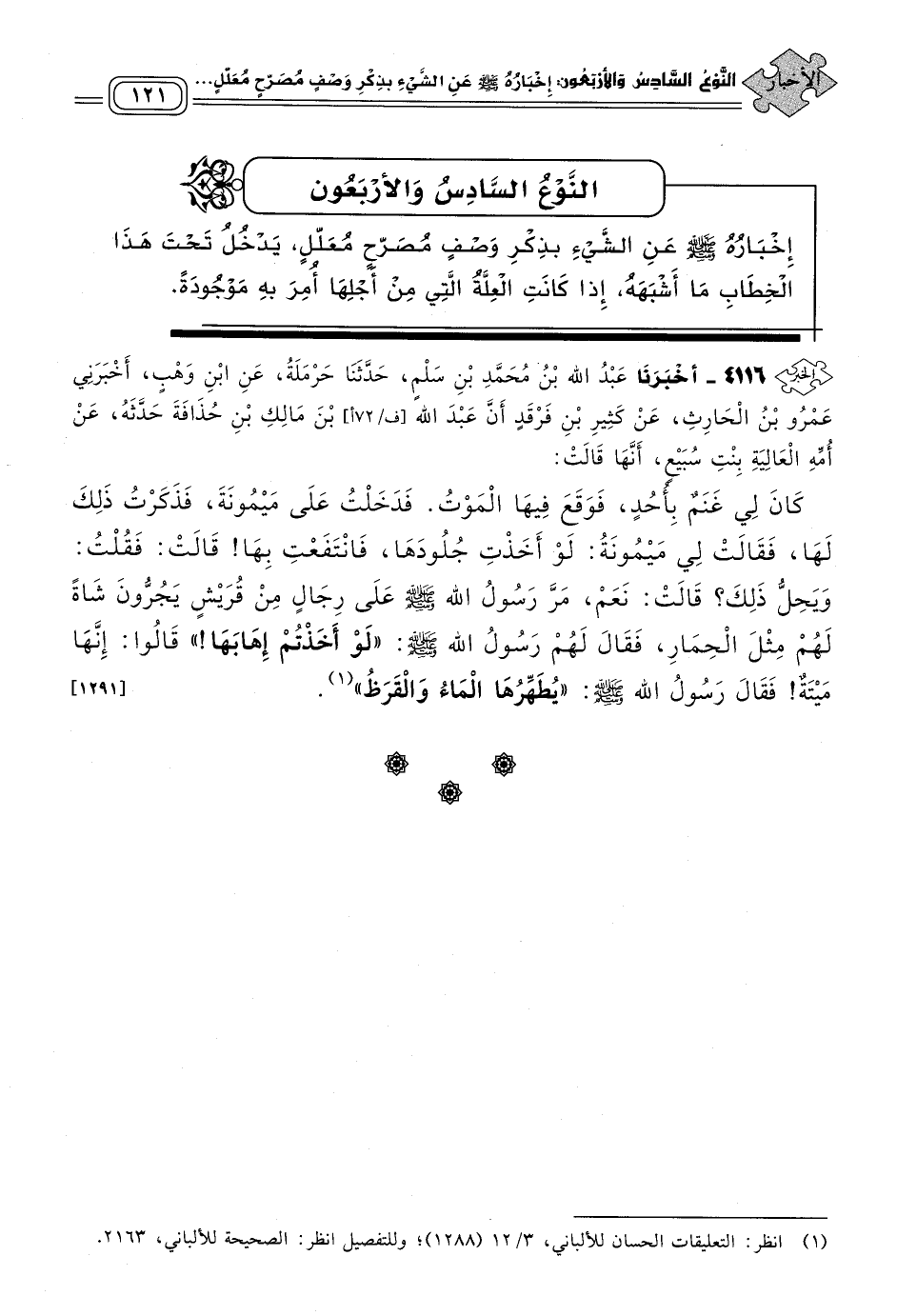 ٤١١٦ - أخبرنا عبد الله بن محمد بن سلم، حدثنا حرملة، عن ابن وهب، أخبرني عمرو بن الحارث، عن كثير بن فرقد أن عبد الله بن مالك بن حذافة حدثه، عن أمه العالية بنت سبيع، أنها قالت: كان لي غنم بأحد، فوقع فيها الموت. فدخلت على ميمونة، فذكرت ذلك لها، فقالت لي ميمونة: لو أخذت جلودها، فانتفعت بها! قالت: فقلت: ويحل ذلك؟ قالت: نعم، مر رسول الله صلى الله عليه وسلم على رجال من قريش يجرون شاة لهم مثل الحمار، فقال لهم رسول الله صلى الله عليه وسلم: "لو أخذتم إهابها" قالوا: إنها ميتة! فقال رسول الله صلى الله عليه وسلم: "يطهرها الماء والقرظ". [١٢٩١]