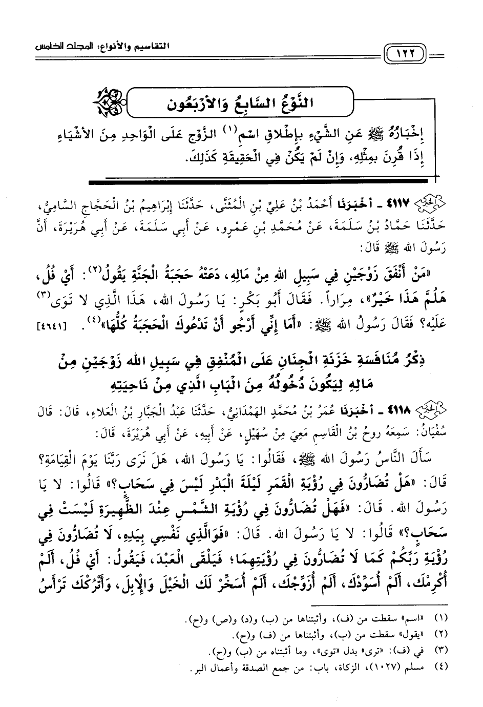 ٤١١٧ - أَخْبَرَنَا أَحْمَدُ بْنُ عَلِيِّ بْنِ الْمُثَنَّى، حَدَّثَنَا إِبْرَاهِيمُ بْنُ الْحَجَّاجِ السَّامِيُّ، حَدَّثَنَا حَمَّادُ بْنُ سَلَمَةَ، عَنْ مُحَمَّدِ بْنِ عَمْرٍو، عَنْ أَبِي سَلَمَةَ، عَنْ أَبِي هُرَيْرَةَ، أَنَّ رَسُولَ اللهِ صَلَّى اللَّهُ عَلَيْهِ وَسَلَّمَ قَالَ: "مَنْ أَنْفَقَ زَوْجَيْنِ فِي سَبِيلِ اللهِ مِنْ مَالِهِ، دَعَتْهُ حَجَبَةُ الْجَنَّةِ يقول: أَيْ فُلُ، هَلُمَّ هَذَا خَيْرٌ" مِرَارًا، فَقَالَ أَبُو بَكْرٍ: يَا رَسُولَ اللهِ، هَذَا الَّذِي لَا تَوَى عَلَيْهِ، فَقَالَ رَسُولُ اللهِ صَلَّى اللَّهُ عَلَيْهِ وَسَلَّمَ: "أَمَا إِنِّي أَرْجُو أَنْ تَدْعُوكَ الْحَجَبَةُ كُلُّهَا". [٤٦٤١]