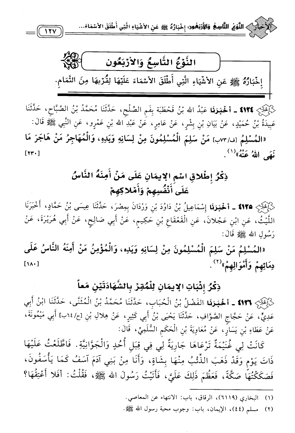 ٤١٢٥ - أَخبَرنا إِسْمَاعِيلُ بْنُ دَاوُدَ بْنِ وَرْدَانَ بِمِصْرَ، حَدثنا عِيسَى بْنُ حَمَّادٍ، أَخبَرنا اللَّيْثُ، عَنِ ابْنِ عَجْلَانَ، عَنِ الْقَعْقَاعِ بْنِ حَكِيمٍ، عَنْ أَبِي صَالِحٍ، عَنْ أَبِي هُرَيْرَةَ، عَنْ رَسُولِ اللهِ صَلى الله عَلَيه وسَلم قَالَ: "الْمُسْلِمُ مَنْ سَلِمَ الْمُسْلِمُونَ مِنْ لِسَانِهِ وَيَدِهِ، وَالْمُؤْمِنُ مَنْ أَمِنَهُ النَّاسُ عَلَى دِمَائِهِمْ وَأَمْوَالِهِمْ". [١٨٠]