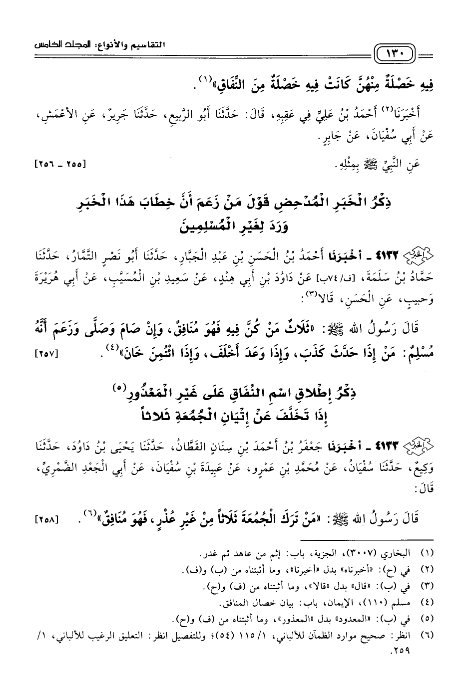 ٤١٣٢ - أَخبَرنا أَحْمَدُ بْنُ الْحَسَنِ بْنِ عَبْدِ الْجَبَّارِ، حَدثنا أَبُو نَصْرٍ التَّمَّارُ، حَدثنا حَمَّادُ بْنُ سَلَمَةَ، عَنْ دَاوُدَ بْنِ أَبِي هِنْدٍ، عَنْ سَعِيدِ بْنِ الْمُسَيَّبِ، عَنْ أَبِي هُرَيْرَةَ، وَحَبِيبٍ، عَنِ الْحَسَنِ، قَالَا: قَالَ رَسُولُ اللهِ صَلى الله عَلَيه وسَلم: "ثَلَاثٌ مَنْ كُنَّ فِيهِ فَهُوَ مُنَافِقٌ، وَإِنْ صَامَ وَصَلَّى وَزَعَمَ أَنَّهُ مُسْلِمٌ: مَنْ إِذَا حَدَّثَ كَذَبَ، وَإِذَا وَعَدَ أَخْلَفَ، وَإِذَا ائْتُمِنَ خَانَ". [٢٥٧]