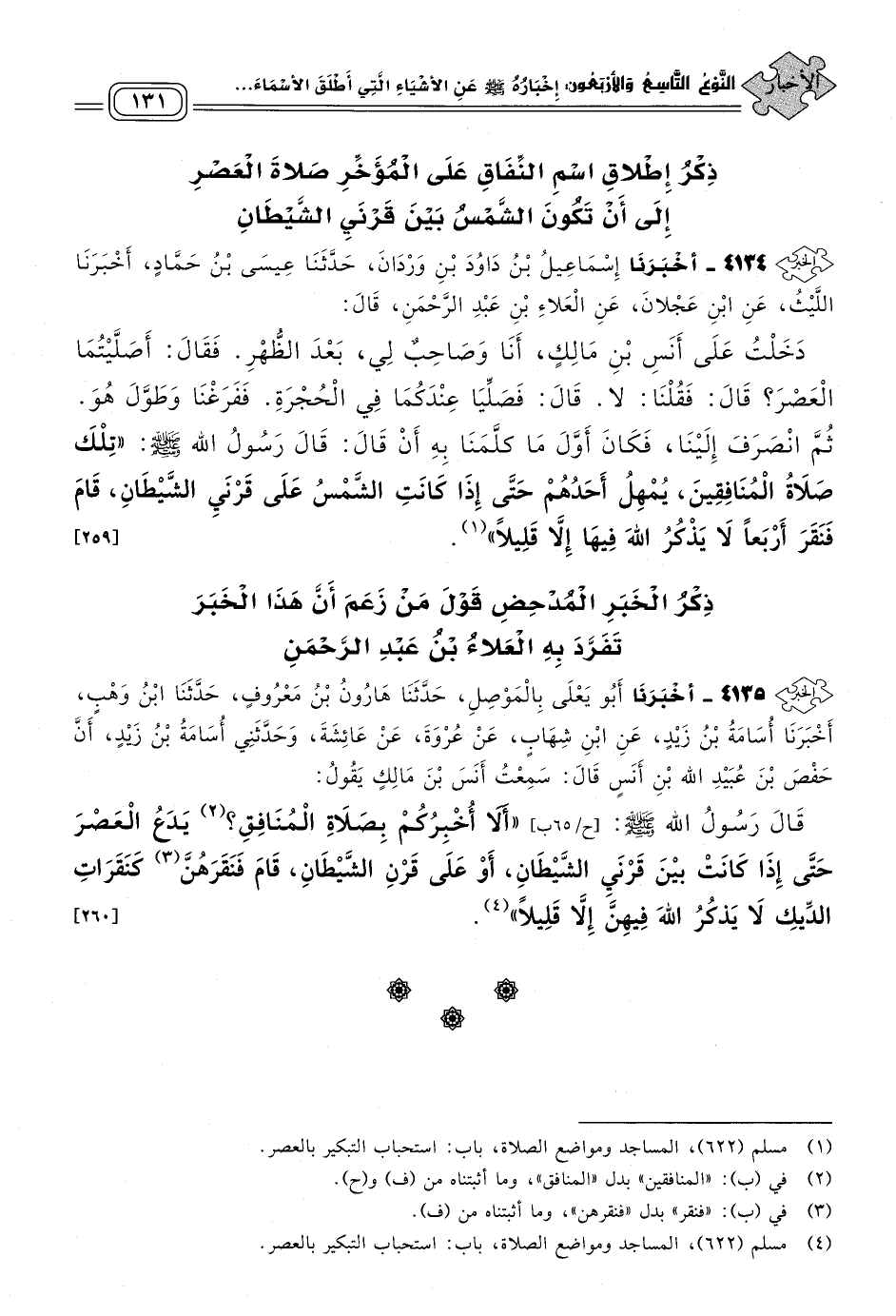 ٤١٣٤ - أَخبَرنا إِسْمَاعِيلُ بْنُ دَاوُدَ بْنِ وَرْدَانَ، حَدثنا عِيسَى بْنُ حَمَّادٍ، أَخبَرنا اللَّيْثُ، عَنِ ابْنِ عَجْلَانَ، عَنِ الْعَلَاءِ بْنِ عَبْدِ الرَّحْمَنِ قَالَ: دَخَلْتُ عَلَى أَنَسِ بْنِ مَالِكٍ، أَنَا وَصَاحِبٌ لِي، بَعْدَ الظُّهْرِ، فَقَالَ: أَصَلَّيْتُمَا الْعَصْرَ؟ قَالَ: فَقُلْنَا: لَا، قَالَ: فَصَلِّيَا عِنْدَكُمَا فِي الْحُجْرَةِ، فَفَرَغْنَا وَطَوَّلَ هُوَ، ثُمَّ انْصَرَفَ إِلَيْنَا، فَكَانَ أَوَّلَ مَا كَلَّمَنَا بِهِ أَنْ قَالَ: قَالَ رَسُولُ اللهِ صَلى الله عَلَيه وسَلم: "تِلْكَ صَلَاةُ الْمُنَافِقِينَ، يُمْهِلُ أَحَدُهُمْ حَتَّى إِذَا كَانَتِ الشَّمْسُ عَلَى قَرْنَيِ الشَّيْطَانِ، قَامَ فَنَقَرَ أَرْبَعًا لَا يَذْكُرُ اللهَ فِيهَا إِلَاّ قَلِيلاً". [٢٥٩]