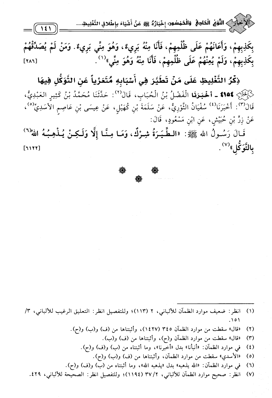 ٤١٥٤ - أَخبَرنا الْفَضْلُ بْنُ الْحُبَابِ، قَالَ: حَدثنا مُحَمَّدُ بْنُ كَثِيرٍ الْعَبْدِيُّ، قَالَ: أَخبَرنا سُفْيَانُ الثَّوْرِيُّ، عَنْ سَلَمَةَ بْنِ كُهَيْلٍ، عَنْ عِيسَى بْنِ عَاصِمٍ الأَسَدِيِّ، عَنْ زِرِّ بْنِ حُبَيْشٍ، عَنِ ابْنِ مَسْعُودٍ، قَالَ: قَالَ رَسُولُ اللهِ صَلى الله عَلَيه وسَلم: "الطِّيَرَةُ شِرْكٌ، وَمَا مِنَّا إِلَاّ وَلَكِنْ يُذْهِبُهُ اللهُ بِالتَّوَكُّلِ". [٦١٢٢]