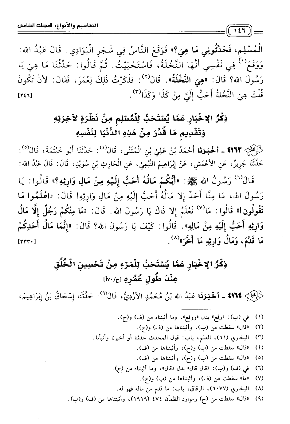 ٤١٦٣ - أَخبَرنا أَحْمَدُ بْنُ عَلِيِّ بْنِ الْمُثَنَّى، قال: حَدثنا أَبُو خَيْثَمَةَ، قال: حَدثنا جَرِيرٌ، عَنِ الأَعْمَشِ، عَنْ إِبْرَاهِيمَ التَّيْمِيِّ، عَنِ الْحَارِثِ بْنِ سُوَيْدٍ، قَالَ: قَالَ عَبْدُ اللهِ: قَالَ رَسُولُ اللهِ صَلى الله عَلَيه وسَلم: "أَيُّكُمْ مَالُهُ أَحَبُّ إِلَيْهِ مِنْ مَالِ وَارِثِهِ؟ " قَالُوا: يَا رَسُولَ اللهِ، مَا مِنَّا أَحَدٌ إِلَاّ مَالُهُ أَحَبُّ إِلَيْهِ مِنْ مَالِ وَارِثِهِ، قَالَ: "اعْلَمُوا مَا تَقُولُونَ"، قَالُوا: مَا نَعْلَمُ إِلَاّ ذَاكَ يَا رَسُولَ اللهِ، قَالَ: "مَا مِنْكُمْ رَجُلٌ إِلَاّ مَالُ وَارِثِهِ أَحَبُّ إِلَيْهِ مِنْ مَالِهِ"، قَالُوا: كَيْفَ يَا رَسُولَ اللهِ؟ قَالَ: "إِنَّمَا مَالُ أَحَدِكُمْ مَا قَدَّمَ، وَمَالُ وَارِثِهِ مَا أَخَّرَ". [٣٣٣٠]