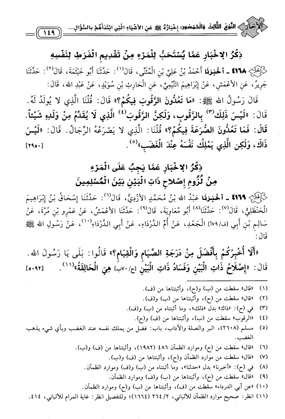 ٤١٦٩ - أَخبَرنا عَبْدُ اللهِ بْنُ مُحَمَّدٍ الأَزْدِيُّ، قَالَ: حَدثنا إِسْحَاقُ بْنُ إِبْرَاهِيمَ الْحَنْظَلِيُّ، قَالَ: حَدثنا أَبُو مُعَاوِيَةَ، قَالَ: حَدثنا الأَعْمَشُ، عَنْ عَمْرِو بْنِ مُرَّةَ، عَنْ سَالِمِ بْنِ أَبِي الْجَعْدِ، عَنْ أُمِّ الدَّرْدَاءِ، عَنْ أَبِي الدَّرْدَاءِ، عَنْ رَسُولِ اللهِ صَلى الله عَلَيه وسَلم قَالَ: "أَلَا أُخْبِرُكُمْ بِأَفْضَلَ مِنْ دَرَجَةِ الصِّيَامِ وَالْقِيَامِ؟ " قَالُوا: بَلَى يَا رَسُولَ اللهِ، قَالَ: "إِصْلَاحُ ذَاتِ الْبَيْنِ، وَفَسَادُ ذَاتِ الْبَيْنِ هِيَ الْحَالِقَةُ". [٥٠٩٢]