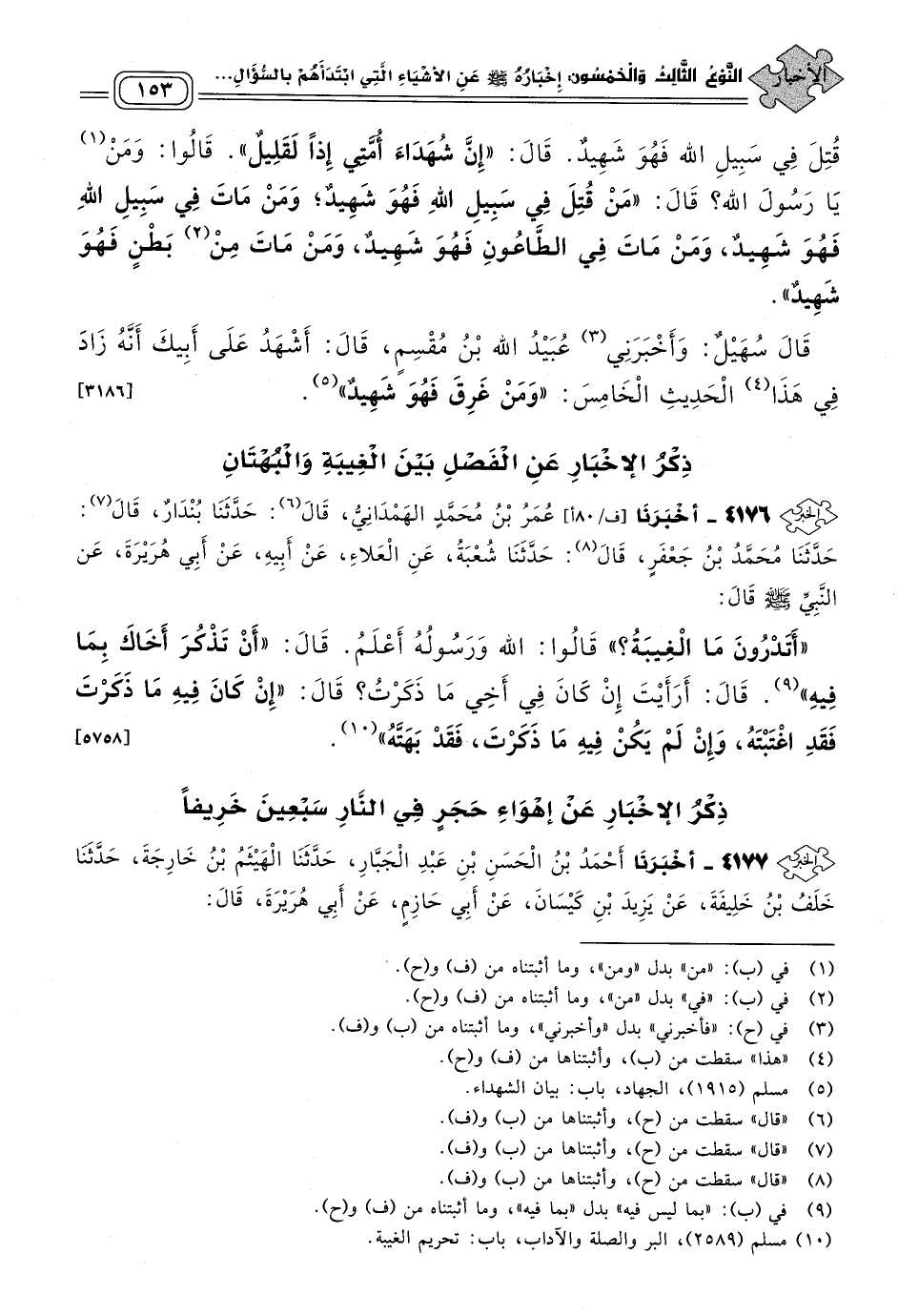 ٤١٧٦ - أَخبَرنا عُمَرُ بْنُ مُحَمَّدٍ الْهَمْدَانِيُّ، قَالَ: حَدثنا بُنْدَارٌ، قَالَ: حَدثنا مُحَمَّدُ بْنُ جَعْفَرٍ، قَالَ: حَدثنا شُعْبَةُ، عَنِ الْعَلَاءِ، عَنْ أَبِيهِ، عَنْ أَبِي هُرَيْرَةَ، عَنِ النَّبِيِّ صَلى الله عَلَيه وسَلم قَالَ: "أَتَدْرُونَ مَا الْغِيبَةُ؟ " قَالُوا: اللهُ وَرَسُولُهُ أَعْلَمُ، قَالَ: "أَنْ تَذْكُرَ أَخَاكَ بِمَا لَيْسَ فِيهِ"، قَالَ: أَرَأَيْتَ إِنْ كَانَ فِي أَخِي مَا ذَكَرْتُ؟ قَالَ: "إِنْ كَانَ فِيهِ مَا ذَكَرْتَ فَقَدِ اغْتَبْتَهُ، وَإِنْ لَمْ يَكُنْ فِيهِ مَا ذَكَرْتَ فَقَدْ بَهَتَّهُ". [٥٧٥٨]