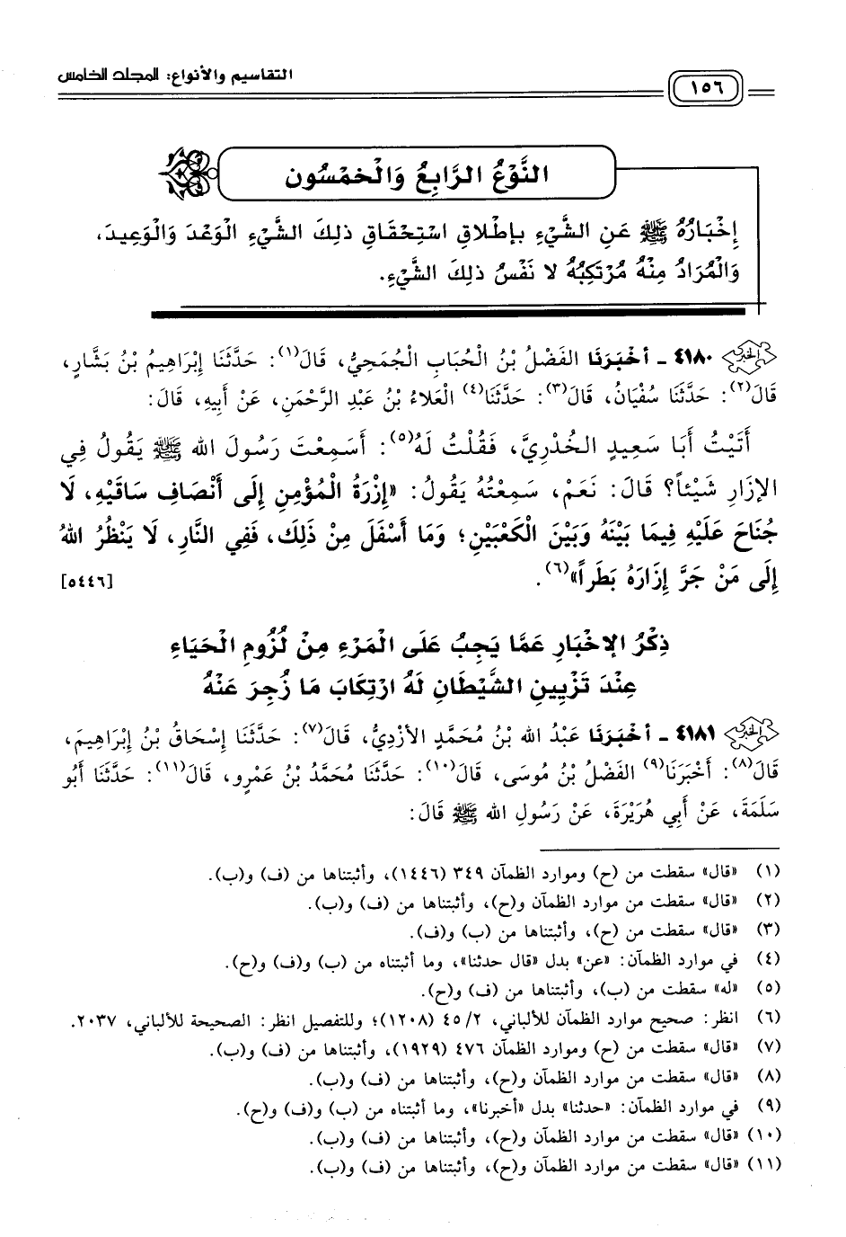 ٤١٨٠ - أَخبَرنا الْفَضْلُ بْنُ الْحُبَابِ الْجُمَحِيُّ، قَالَ: حَدثنا إِبْرَاهِيمُ بْنُ بَشَّارٍ، قَالَ: حَدثنا سُفْيَانُ، قَالَ: حَدثنا الْعَلَاءُ بْنُ عَبْدِ الرَّحْمَنِ، عَنْ أَبِيهِ، قَالَ: أَتَيْتُ أَبَا سَعِيدٍ الْخُدْرِيَّ، فَقُلْتُ له: أَسَمِعْتَ رَسُولَ اللهِ صَلى الله عَلَيه وسَلم يَقُولُ فِي الإِزَارِ شَيْئًا؟ قَالَ: نَعَمْ، سَمِعْتُهُ يَقُولُ: "إِزْرَةُ الْمُؤْمِنِ إِلَى أَنْصَافِ سَاقَيْهِ، لَا جُنَاحَ عَلَيْهِ فِيمَا بَيْنَهُ وَبَيْنَ الْكَعْبَيْنِ، وَمَا أَسْفَلَ مِنْ ذَلِكَ فَفِي النَّارِ، لَا يَنْظُرُ اللهُ إِلَى مَنْ جَرَّ إِزَارَهُ بَطَرًا". [٥٤٤٦]