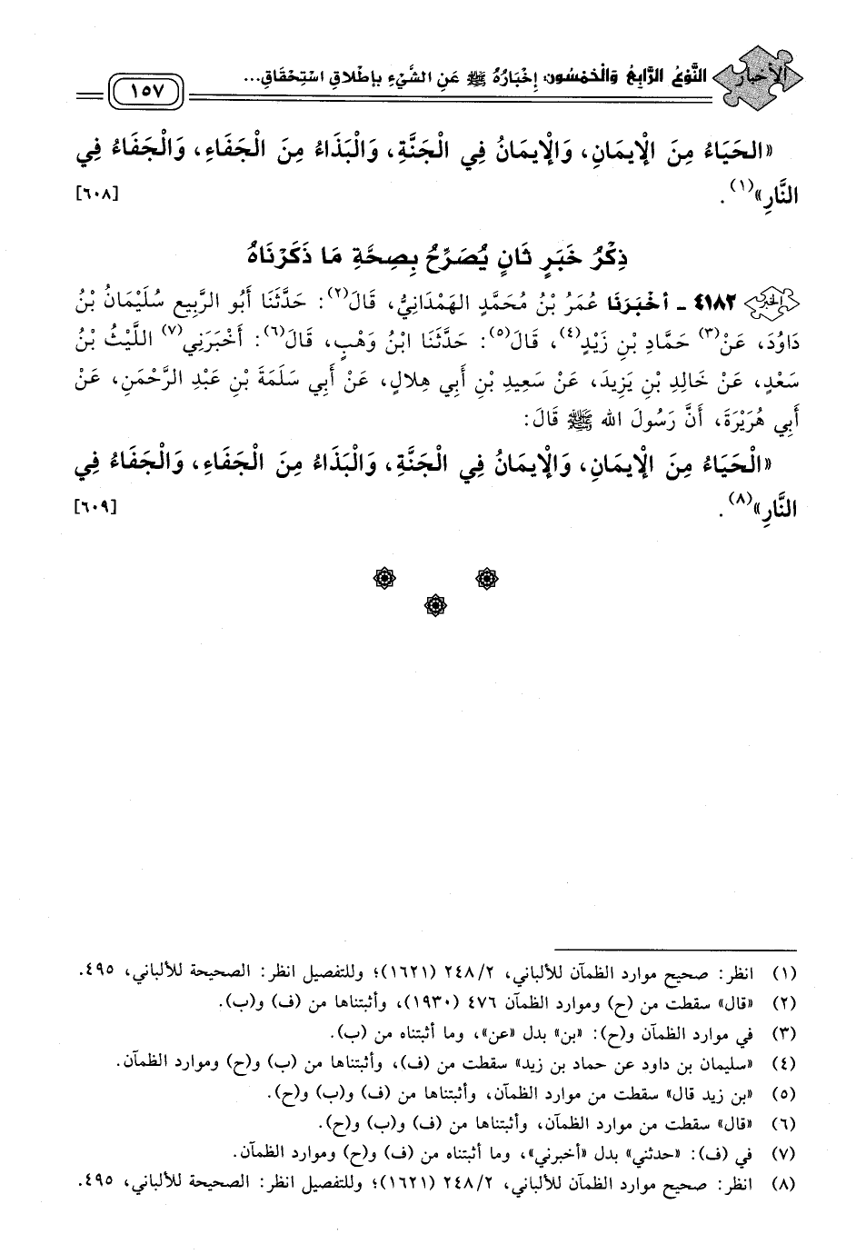 ٤١٨٢ - أَخبَرنا عُمَرُ بْنُ مُحَمَّدٍ الْهَمْدَانِيُّ، قَالَ: حَدثنا أَبُو الرَّبِيعِ سُلَيْمَانُ بْنُ دَاوُدَ، عَنْ حَمَّادِ بْنِ زَيْدٍ، قَالَ: حَدثنا ابْنُ وَهْبٍ، قَالَ: أَخْبَرَنِي اللَّيْثُ بْنُ سَعْدٍ، عَنْ خَالِدِ بْنِ يَزِيدَ، عَنْ سَعِيدِ بْنِ أَبِي هِلَالٍ، عَنْ أَبِي سَلَمَةَ بْنِ عَبْدِ الرَّحْمَنِ، عَنْ أَبِي هُرَيْرَةَ؛ أَنَّ رَسُولَ اللهِ صَلى الله عَلَيه وسَلم قَالَ: "الْحَيَاءُ مِنَ الإِيمَانِ، وَالإِيمَانُ فِي الْجَنَّةِ، وَالْبَذَاءُ مِنَ الْجَفَاءِ، وَالْجَفَاءُ فِي النَّارِ". [٦٠٩]