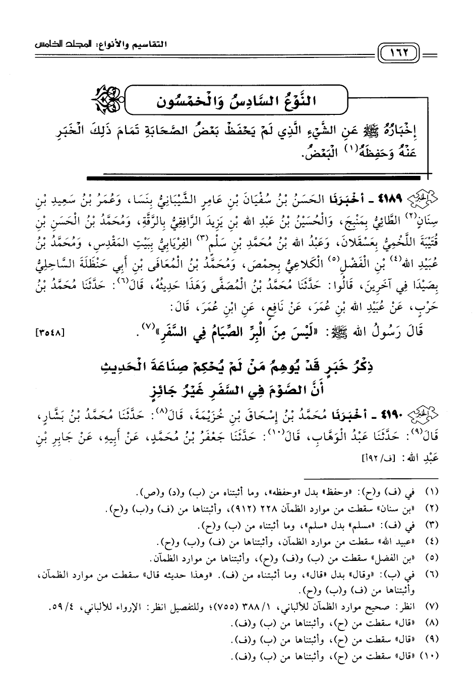 ٤١٨٩ - أَخبَرنا الْحَسَنُ بْنُ سُفْيَانَ بْنِ عَامِرٍ الشَّيْبَانِيُّ، بِنَسَا، وَعُمَرُ بْنُ سَعِيدِ بْنِ سِنَانٍَ الطَّائِيُّ بِمَنْبِجَ، وَالْحُسَيْنُ بْنُ عَبْدِ اللهِ بْنِ يَزِيدَ الرَّافِقِيُّ بِالرَّقَّةِ، وَمُحَمَّدُ بْنُ الْحَسَنِ بْنِ قُتَيْبَةَ اللَّخْمِيُّ بِعَسْقَلَانَ، وَعَبْدُ اللهِ بْنُ مُحَمَّدِ بْنِ سَلْمٍ الْفِرْيَابِيُّ بِبَيْتِ الْمَقْدِسِ، وَمُحَمَّدُ بْنُ عُبَيْدِ اللهِ بن الفضل الْكَلَاعِيُّ بِحِمْصَ، وَمُحَمَّدُ بْنُ الْمُعَافَى بْنِ أَبَى حَنْظَلَةَ السَّاحِلِيُّ بِصَيْدَا فِي آخَرِينَ، قَالُوا: حَدثنا مُحَمَّدُ بْنُ الْمُصَفَّى وَهَذَا حَدِيثُهُ، قَالَ: حَدثنا مُحَمَّدُ بْنُ حَرْبٍ، عَنْ عُبَيْدِ اللهِ بْنِ عُمَرَ، عَنْ نَافِعٍ، عَنِ ابْنِ عُمَرَ، قَالَ: قَالَ رَسُولُ اللهِ صَلى الله عَلَيه وسَلم: "لَيْسَ مِنَ الْبِرِّ الصِّيَامُ فِي السَّفَرِ". [٣٥٤٨]