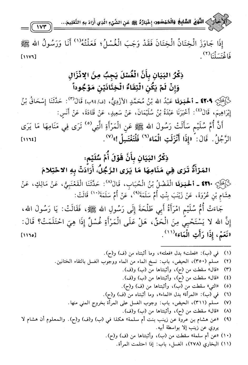 ٤٢١٠ - أَخبَرنا الْفَضْلُ بْنُ الْحُبَابِ، قَالَ: حَدثنا الْقَعْنَبِيُّ، عَنْ مَالِكٍ، عَنْ هِشَامِ بْنِ عُرْوَةَ، عَنْ أَبِيهِ، عَنْ زَيْنَبَ بِنْتِ أُمِّ سَلَمَةَ، عَنْ أُمِّ سَلَمَةَ، قَالَتْ: جَاءَتْ أُمُّ سُلَيْمٍ امْرَأَةُ أَبِي طَلْحَةَ إِلَى رَسُولِ اللهِ صَلى الله عَلَيه وسَلم، فَقَالَتْ: يَا رَسُولَ اللهِ، إِنَّ اللهَ لَا يَسْتَحْيِي مِنَ الْحَقِّ، هَلْ عَلَى الْمَرْأَةِ غُسْلٌ إِذَا هِيَ احْتَلَمَتْ؟ قَالَ: "نَعَمْ، إِذَا رَأَتِ الْمَاءَ". [١١٦٥]