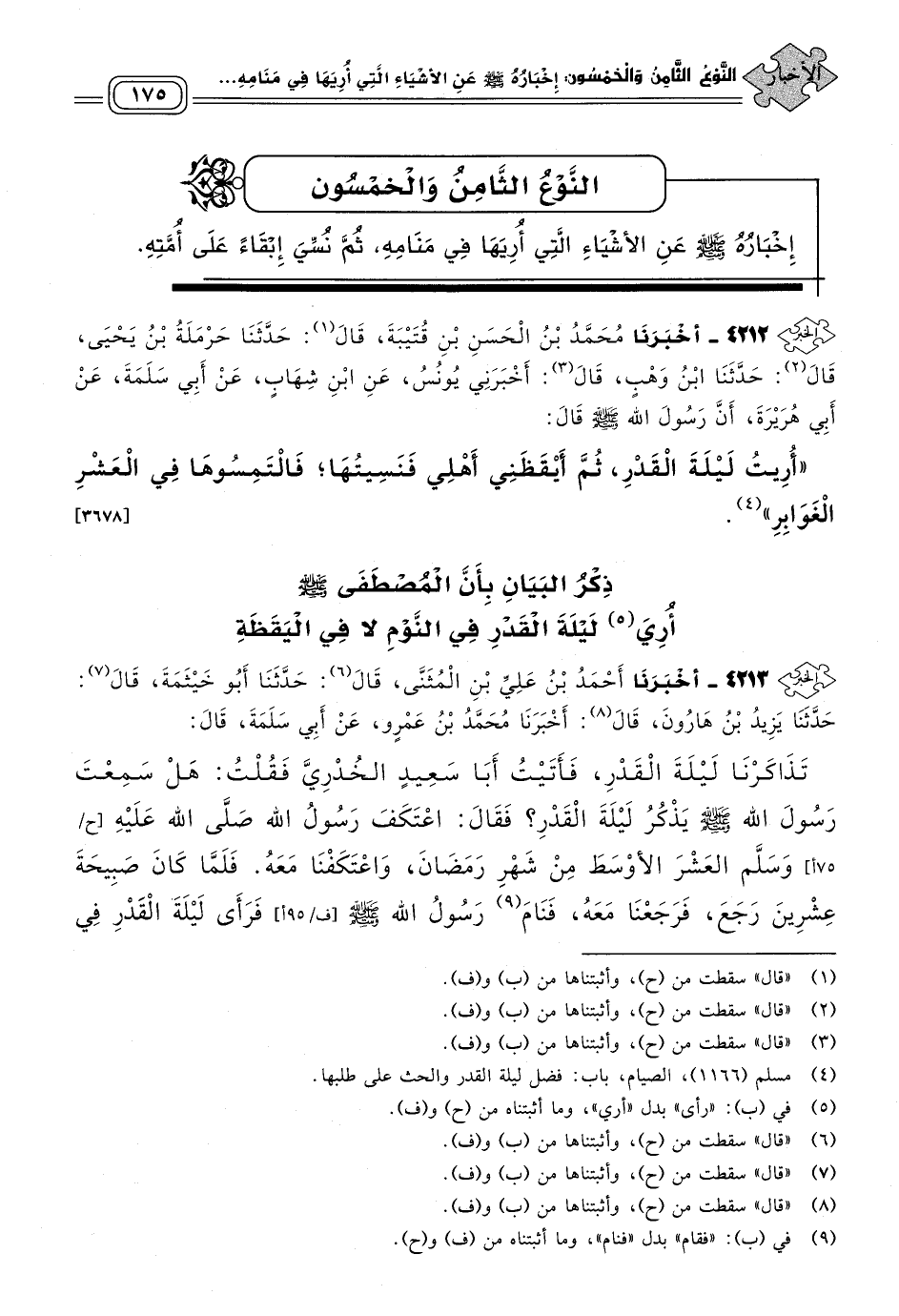 ٤٢١٣ - أَخبَرنا أَحْمَدُ بْنُ عَلِيِّ بْنِ الْمُثَنَّى، قَالَ: حَدثنا أَبُو خَيْثَمَةَ، قَالَ: حَدثنا يَزِيدُ بْنُ هَارُونَ، قَالَ: أَخبَرنا مُحَمَّدُ بْنُ عَمْرٍو، عَنْ أَبِي سَلَمَةَ، قَالَ: تَذَاكَرْنَا لَيْلَةَ الْقَدْرِ، فَأَتَيْتُ أَبَا سَعِيدٍ الْخُدْرِيَّ فَقُلْتُ: هَلْ سَمِعْتَ رَسُولَ اللهِ صَلى الله عَلَيه وسَلم يَذْكُرُ لَيْلَةَ الْقَدْرِ؟ فَقَالَ: اعْتَكَفَ رَسُولُ اللهِ صَلى الله عَلَيه وسَلم الْعَشْرَ الأَوْسَطَ مِنْ شَهْرِ رَمَضَانَ، وَاعْتَكَفْنَا مَعَهُ، فَلَمَّا كَانَ صَبِيحَةَ عِشْرِينَ رَجَعَ فَرَجَعْنَا مَعَهُ، فَنَامَ رَسُولُ اللهِ صَلى الله عَلَيه وسَلم فَرَأَى لَيْلَةَ الْقَدْرِ فِي الْمَنَامِ، ثُمَّ أُنْسِيَهَا. [٣٦٧٧]