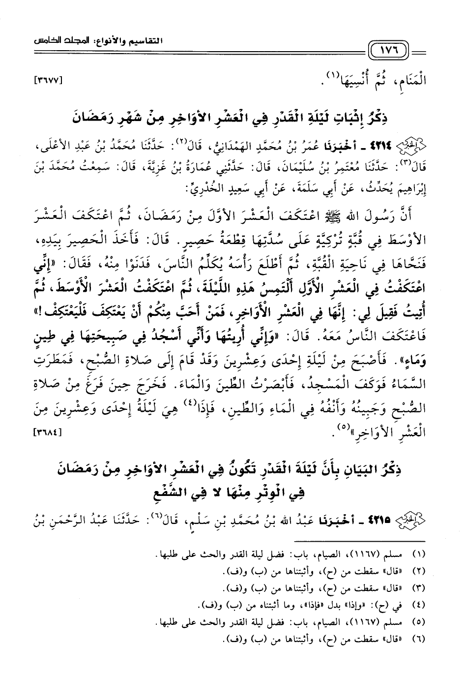 ٤٢١٥ - أَخبَرنا عَبْدُ اللهِ بْنُ مُحَمَّدِ بْنِ سَلْمٍ، قَالَ: حَدثنا عَبْدُ الرَّحْمَنِ بْنُ إِبْرَاهِيمَ، قَالَ: حَدثنا الْوَلِيدُ، قَالَ: حَدثنا الأَوْزَاعِيُّ، قَالَ: حَدَّثَنِي يَحْيَى بْنُ أَبِي كَثِيرٍ، عَنْ أَبِي سَلَمَةَ، قَالَ: أَتَيْتُ أَبَا سَعِيدٍ الْخُدْرِيَّ، فَقُلْتُ: يَا أَبَا سَعِيدٍ، اخْرُجْ بِنَا إِلَى النَّخْلِ نَتَحَدَّثُ، قَالَ: نَعَمْ، فَدَعَا بِخَمِيصَةٍ يَلْبَسُهَا ثُمَّ خَرَجَ، فَقُلْتُ: يَا أَبَا سَعِيدٍ: هَلْ سَمِعْتَ رَسُولَ اللهِ صَلى الله عَلَيه وسَلم يَذْكُرُ لَيْلَةَ الْقَدْرِ؟ قَالَ: نَعَمْ، اعْتَكَفْنَا مَعَ رَسُولِ اللهِ صَلى الله عَلَيه وسَلم لِعَشْرٍ مِنْ رَمَضَانَ، فَلَمَّا كَانَ صَبِيحَةَ عِشْرِينَ قَامَ فِينَا رَسُولُ اللهِ صَلى الله عَلَيه وسَلم، فَقَالَ: "مَنْ كَانَ خَرَجَ فَلْيَرْجِعْ، فَإِنِّي أُرِيتُ لَيْلَةَ الْقَدْرِ، وَإِنِّي أُنْسِيتُهَا، وَإِنِّي رَأَيْتُ أَن أَسْجُدَ فِي مَاءٍ وَطِينٍ، فَالْتَمِسُوهَا فِي الْعَشْرِ الأَوَاخِرِ مِنْ شَهْرِ رَمَضَانَ فِي وِتْرٍ"، قَالَ أَبُو سَعِيدٍ: وَمَا نَرَى فِي السَّمَاءِ قَزَعَةً، فَلَمَّا كَانَ اللَّيْلُ إِذَا السَّحَابُ أَمْثَالُ الْجِبَالِ، فَمُطِرْنَا حَتَّى سَالَ سَقْفُ الْمَسْجِدِ، قَالَ: وَسَقْفُهُ يَوْمَئِذٍ مِنْ جَرِيدِ النَّخْلِ، حَتَّى رَأَيْتُ رَسُولَ اللهِ صَلى الله عَلَيه وسَلم سَجَدَ فِي مَاءٍ وَطِينٍ، حَتَّى رَأَيْتُ الطِّينَ فِي أَرْنَبَةِ رَسُولِ اللهِ صَلى الله عَلَيه وسَلم. [٣٦٨٥]