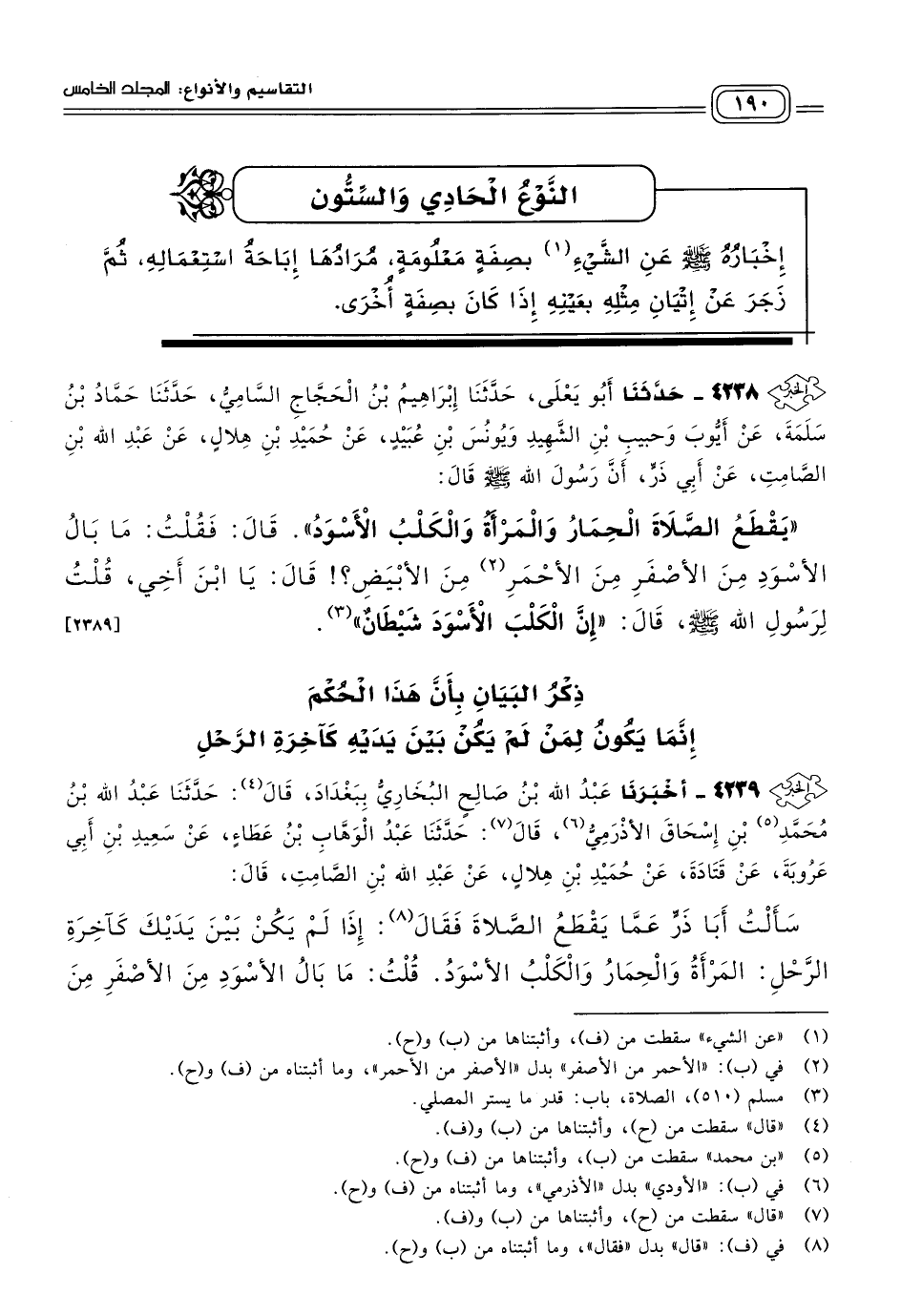 ٤٢٣٨ - حَدثنا أَبُو يَعْلَى، حَدثنا إِبْرَاهِيمُ بْنُ الْحَجَّاجِ السَّامِيُّ، حَدثنا حَمَّادُ بْنُ سَلَمَةَ، عَنْ أَيُّوبَ، وَحَبِيبِ بْنِ الشَّهِيدِ، وَيُونُسَ بْنِ عُبَيْدٍ، عَنْ حُمَيْدِ بْنِ هِلَالٍ، عَنْ عَبْدِ اللهِ بْنِ الصَّامِتِ، عَنْ أَبِي ذَرٍّ، أَنَّ رَسُولَ اللهِ صَلى الله عَلَيه وسَلم قَالَ: "يَقْطَعُ الصَّلَاةَ الْحِمَارُ وَالْمَرْأَةُ وَالْكَلْبُ الأَسْوَدُ"، قَالَ: فَقُلْتُ: مَا بَالُ الأَسْوَدِ مِنَ الأَصْفَرِ مِنَ الأَحْمَرِ مِنَ الأَبْيَضِ؟ قَالَ: يَا ابْنَ أَخِي، قُلْتُ لِرَسُولِ اللهِ صَلى الله عَلَيه وسَلم، قَالَ: "إِنَّ الْكَلْبَ الأَسْوَدَ شَيْطَانٌ". [٢٣٨٩]