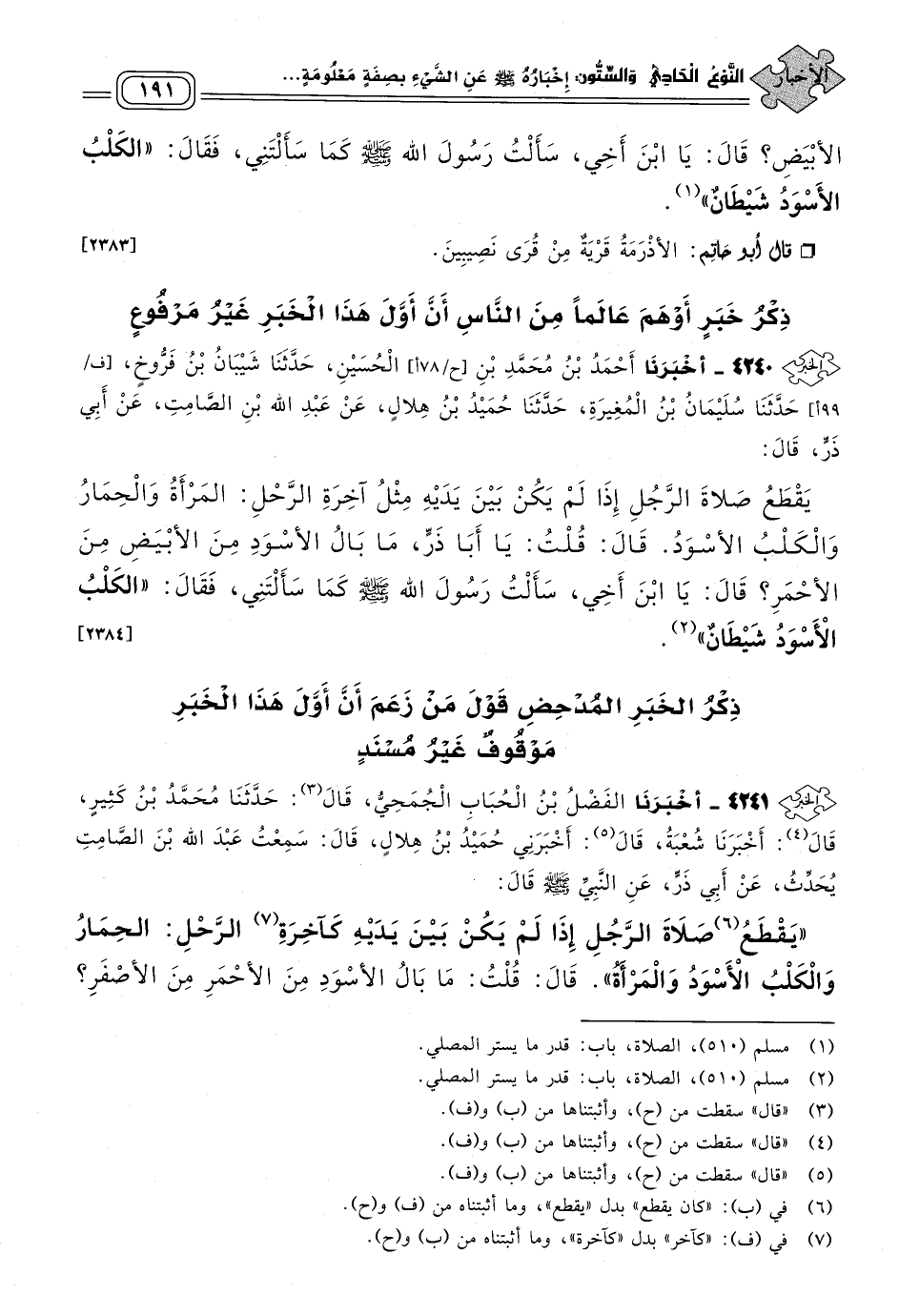 ٤٢٤١ - أَخبَرنا الْفَضْلُ بْنُ الْحُبَابِ الْجُمَحِيُّ، قَالَ: حَدثنا مُحَمَّدُ بْنُ كَثِيرٍ، قَالَ: أَخبَرنا شُعْبَةُ، قَالَ: أَخْبَرَنِي حُمَيْدُ بْنُ هِلَالٍ، قَالَ: سَمِعْتُ عَبْدَ اللهِ بْنَ الصَّامِتِ يُحَدِّثُ، عَنْ أَبِي ذَرٍّ، عَنِ النَّبِيِّ صَلى الله عَلَيه وسَلم قَالَ: "يَقْطَعُ صَلَاةَ الرَّجُلِ إِذَا لَمْ يَكُنْ بَيْنَ يَدَيْهِ كَآخِرَةِ الرَّحْلِ: الْحِمَارُ وَالْكَلْبُ الأَسْوَدُ وَالْمَرْأَةُ"، قَالَ: قُلْتُ: مَا بَالُ الأَسْوَدِ مِنَ الأَحْمَرِ مِنَ الأَصْفَرِ؟ فَقَالَ: سَأَلْتُ رَسُولَ اللهِ صَلى الله عَلَيه وسَلم كَمَا سَأَلْتَنِي، فَقَالَ: "الأَسْوَدُ شَيْطَانٌ". [٢٣٨٥]