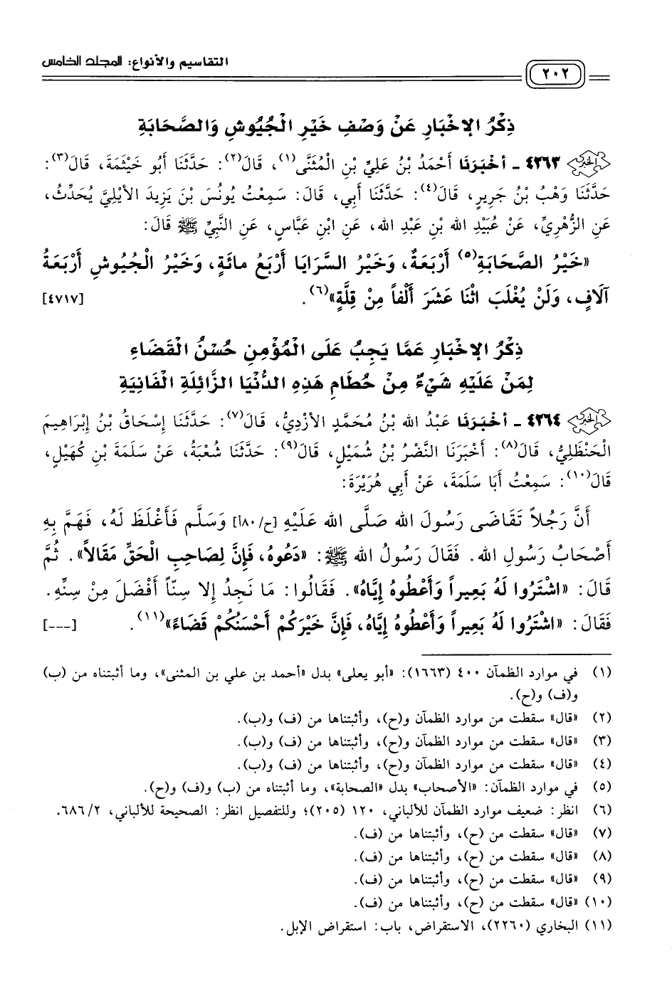 ٤٢٦٣ - أَخبَرنا أَحْمَدُ بْنُ عَلِيِّ بْنِ الْمُثَنَّى، قَالَ: حَدثنا أَبُو خَيْثَمَةَ، قَالَ: حَدثنا وَهْبُ بْنُ جَرِيرٍ، قَالَ: حَدثنا أَبِي، قَالَ: سَمِعْتُ يُونُسَ بْنَ يَزِيدَ الأَيْلِيَّ، يُحَدِّثُ عَنِ الزُّهْرِيِّ، عَنْ عُبَيْدِ اللهِ بْنِ عَبْدِ اللهِ، عَنِ ابْنِ عَبَّاسٍ، عَنِ النَّبِيِّ صَلى الله عَلَيه وسَلم قَالَ: "خَيْرُ الصَّحَابَةِ أَرْبَعَةٌ، وَخَيْرُ السَّرَايَا أَرْبَعُ مِائَةٍ، وَخَيْرُ الْجُيُوشِ أَرْبَعَةُ آلَافٍ، وَلَنْ يُغْلَبَ اثْنَا عَشَرَ أَلْفًا مِنْ قِلَّةٍ". [٤٧١٧]