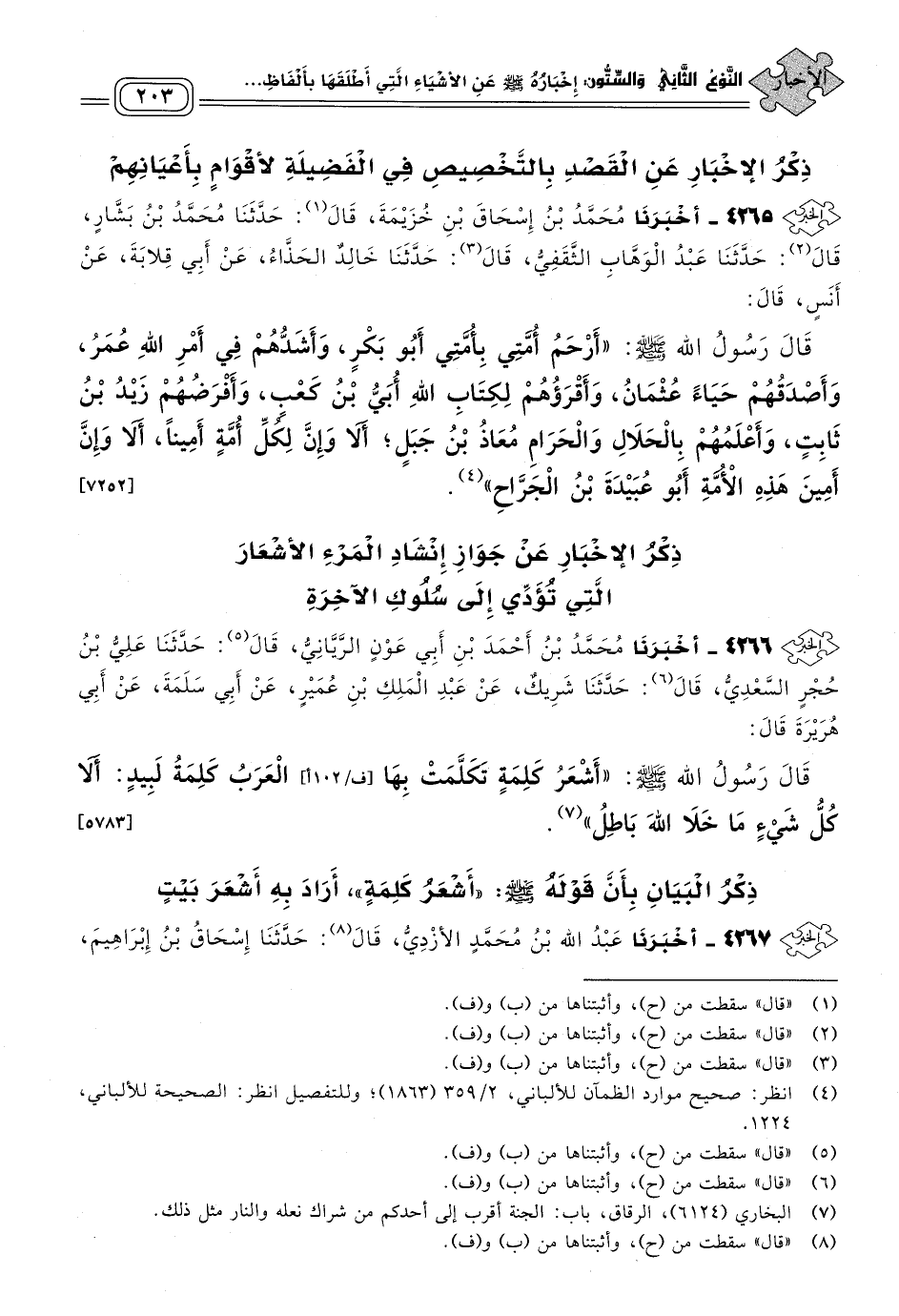 ٤٢٦٥ - أَخبَرنا مُحَمَّدُ بْنُ إِسْحَاقَ بْنِ خُزَيْمَةَ، قَالَ: حَدثنا مُحَمَّدُ بْنُ بَشَّارٍ، قَالَ: حَدثنا عَبْدُ الْوَهَّابِ الثَّقَفِيُّ، قَالَ: حَدثنا خَالِدٌ الْحَذَّاءُ، عَنْ أَبِي قِلَابَةَ، عَنْ أَنَسٍ، قَالَ: قَالَ رَسُولُ اللهِ صَلى الله عَلَيه وسَلم: "أَرْحَمُ أُمَّتِي بِأُمَّتِي أَبُو بَكْرٍ، وَأَشَدُّهُمْ فِي أَمْرِ اللهِ عُمَرُ، وَأَصْدَقُهُمْ حَيَاءً عُثْمَانُ، وَأَقْرَؤُهُمْ لِكِتَابِ اللهِ أُبَيُّ بْنُ كَعْبٍ، وَأَفْرَضُهُمْ زَيْدُ بْنُ ثَابِتٍ، وَأَعْلَمُهُمْ بِالْحَلَالِ وَالْحَرَامِ مُعَاذُ بْنُ جَبَلٍ، أَلَا وَإِنَّ لِكُلِّ أُمَّةٍ أَمِينًا، أَلَا وَإِنَّ أَمِينَ هَذِهِ الأُمَّةِ أَبُو عُبَيْدَةَ بْنُ الْجَرَّاحِ". [٧٢٥٢]