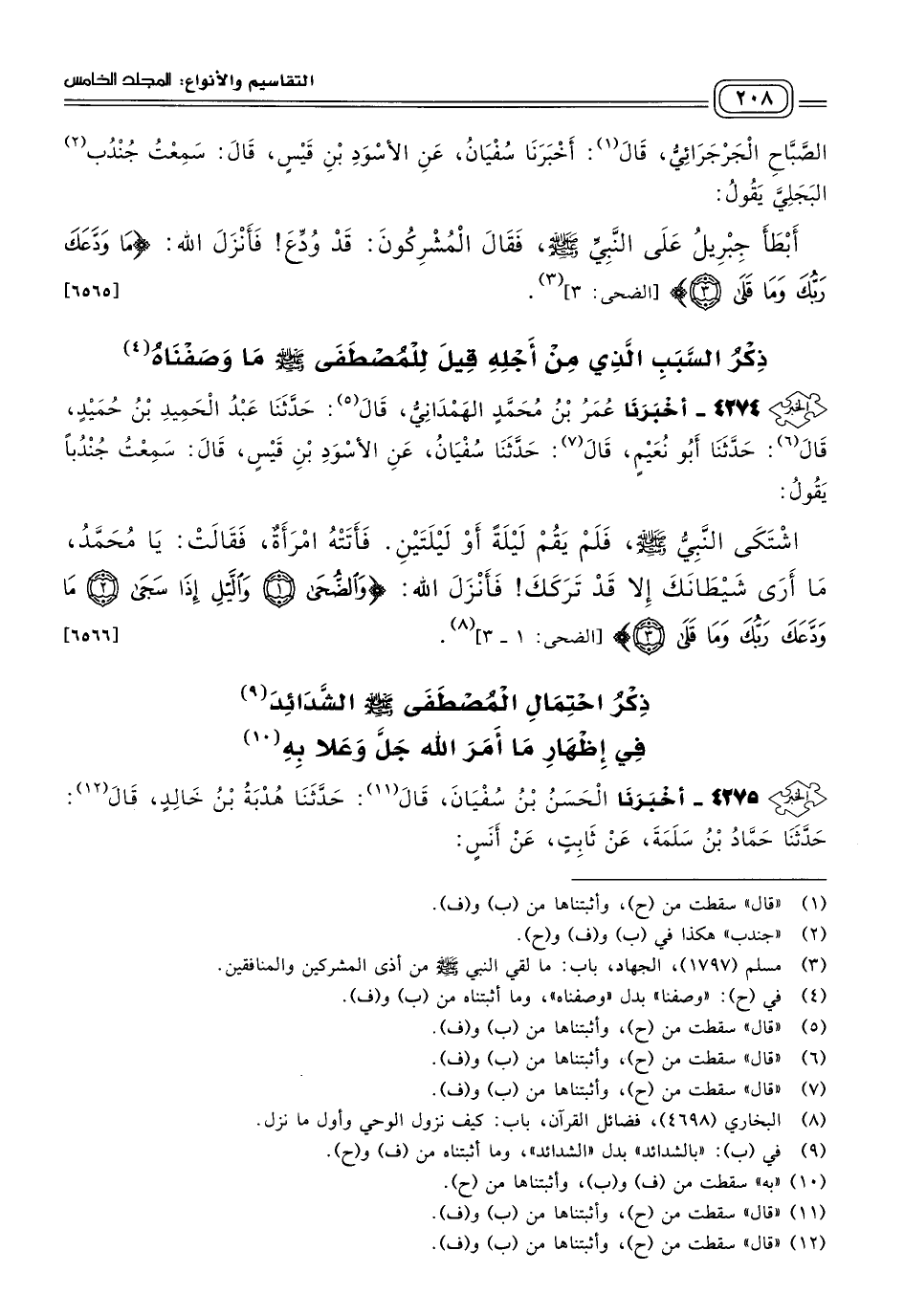 ٤٢٧٤ - أَخبَرنا عُمَرُ بْنُ مُحَمَّدٍ الْهَمْدَانِيُّ، قَالَ: حَدثنا عَبْدُ الْحَمِيدِ بْنُ حُمَيْدٍ، قَالَ: حَدثنا أَبُو نُعَيْمٍ، قَالَ: حَدثنا سُفْيَانُ، عَنِ الأَسْوَدِ بْنِ قَيْسٍ، قَالَ: سَمِعْتُ جُنْدُبًا يَقُولُ: اشْتَكَى النَّبِيُّ صَلى الله عَلَيه وسَلم، فَلَمْ يَقُمْ لَيْلَةً أَوْ لَيْلَتَيْنِ، فَأَتَتْهُ امْرَأَةٌ، فَقَالَتْ: يَا مُحَمَّدُ مَا أَرَى شَيْطَانَكَ إِلَاّ قَدْ تَرَكَكَ، فَأَنْزَلَ اللهُ: {وَالضُّحَى * وَاللَّيْلِ إِذَا سَجَى * مَا وَدَّعَكَ رَبُّكَ وَمَا قَلَى} [الضحى: ١ - ٣]. [٦٥٦٦]
