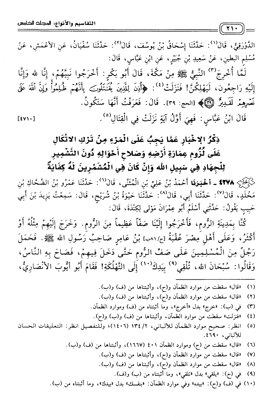 ذِكْرُ الإِخْبَارِ عَمَّا يَجِبُ عَلَى الْمَرْءِ مِنْ تَرْكِ الاِتِّكَالِ عَلَى لُزُومِ عِمَارَةِ أَرْضِهِ وَصَلَاحِ أَحْوَالِهِ دُونَ التَّشْمِيرِ لِلْجِهَادِ فِي سَبِيلِ اللهِ وَإِنْ كَانَ فِي الْمُشَمِّرِينَ لَهُ كِفَايَةٌ.