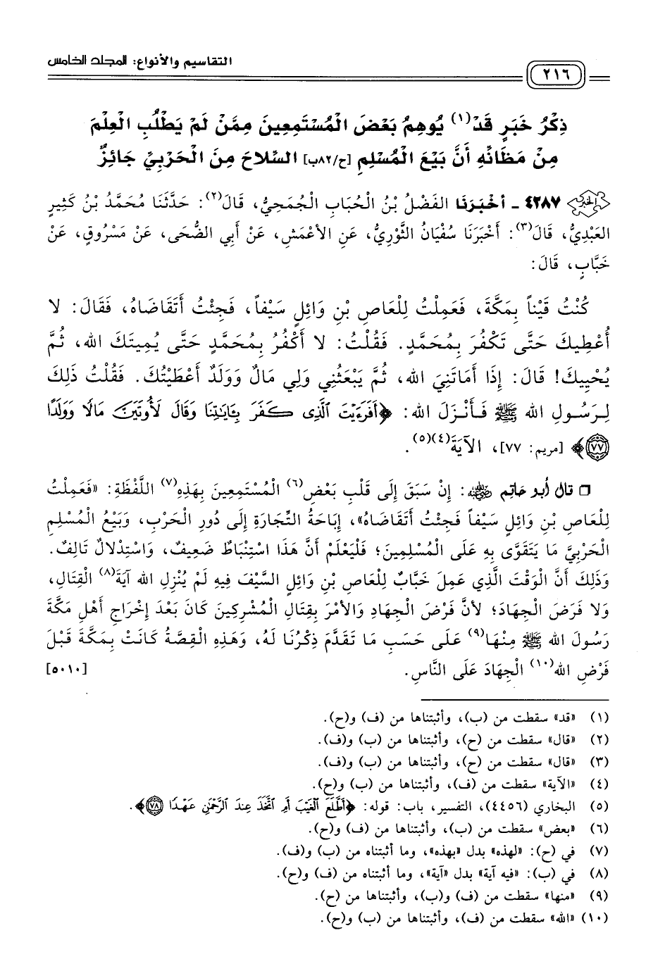 قَالَ أَبُو حَاتِمٍ رَضِيَ اللهُ عَنْهُ: إِنْ سَبَقَ إِلَى قَلْبِ بعض الْمُسْتَمِعِينَ بِهَذِهِ اللَّفْظَةِ: "فَعَمِلْتُ لِلْعَاصِ بْنِ وَائِلٍ سَيْفًا فَجِئْتُ أَتَقَاضَاهُ" إِبَاحَةُ التِّجَارَةِ إِلَى دُورِ الْحَرْبِ وَبَيْعُ الْمُسْلِمِ الْحَرْبِيَّ مَا يَتَقَوَّى بِهِ عَلَى الْمُسْلِمِينَ، فَلْيَعْلَمْ أَنَّ هَذَا اسْتِنْبَاطٌ ضَعِيفٌ وَاسْتِدْلَالٌ تَالِفٌ، وَذَلِكَ أَنَّ الْوَقْتَ الَّذِي عَمِلَ خَبَّابٌ لِلْعَاصِ بْنِ وَائِلٍ السَّيْفَ فِيهِ لَمْ يُنْزِلِ اللهُ آيَةَ الْقِتَالِ، وَلَا فَرَضَ الْجِهَادَ، لأَنَّ فَرْضَ الْجِهَادِ وَالأَمْرَ بِقِتَالِ الْمُشْرِكِينَ كَانَ بَعْدَ إِخْرَاجِ أَهْلِ مَكَّةَ رَسُولَ اللهِ صَلى الله عَلَيه وسَلم منها عَلَى حَسَبِ مَا تَقَدَّمَ ذِكْرُنَا لَهُ، وَهَذِهِ الْقِصَّةُ كَانَتْ بِمَكَّةَ قَبْلَ فَرْضِ اللهِ الْجِهَادَ عَلَى النَّاسِ. [٥٠١٠]