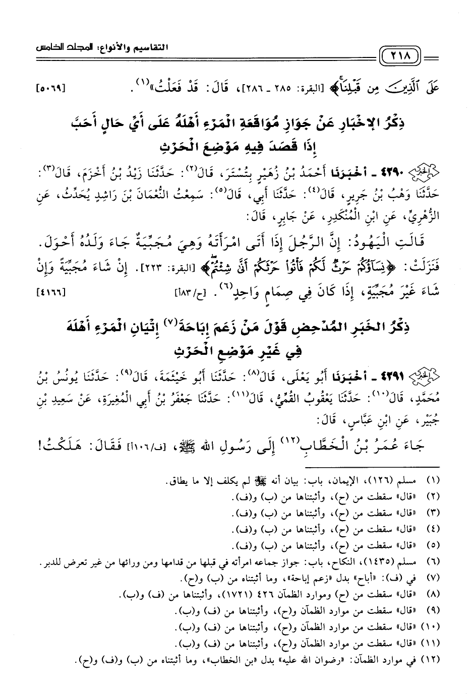 ٤٢٩١ - أَخبَرنا أَبُو يَعْلَى، قَالَ: حَدثنا أَبُو خَيْثَمَةَ، قَالَ: حَدثنا يُونُسُ بْنُ مُحَمَّدٍ، قَالَ: حَدثنا يَعْقُوبُ الْقُمِّيُّ، قَالَ: حَدثنا جَعْفَرُ بْنُ أَبِي الْمُغِيرَةِ، عَنْ سَعِيدِ بْنِ جُبَيْرٍ، عَنِ ابْنِ عَبَّاسٍ قَالَ: جَاءَ عُمَرُ بْنُ الْخَطَّابِ إِلَى رَسُولِ اللهِ صَلى الله عَلَيه وسَلم فَقَالَ: هَلَكْتُ، قَالَ: وَمَا أَهْلَكَكَ؟ قَالَ: حَوَّلْتُ رَحْلِيَ اللَّيْلَةَ، قَالَ: فَلَمْ يَرُدَّ عَلَيْهِ شَيْئًا، فَأَوْحَى اللهُ إِلَى رَسُولِ اللهِ صَلى الله عَلَيه وسَلم هَذِهِ الآيَةَ: {نِسَاؤُكُمْ حَرْثٌ لَكُمْ فَأْتُوا حَرْثَكُمْ أَنَّى شِئْتُمْ} [البقرة: ٢٢٣]. يَقُولُ: أَقْبِلْ وَأَدْبِرْ وَاتَّقِ الدُّبُرَ وَالْحَيْضَةَ. [٤٢٠٢]