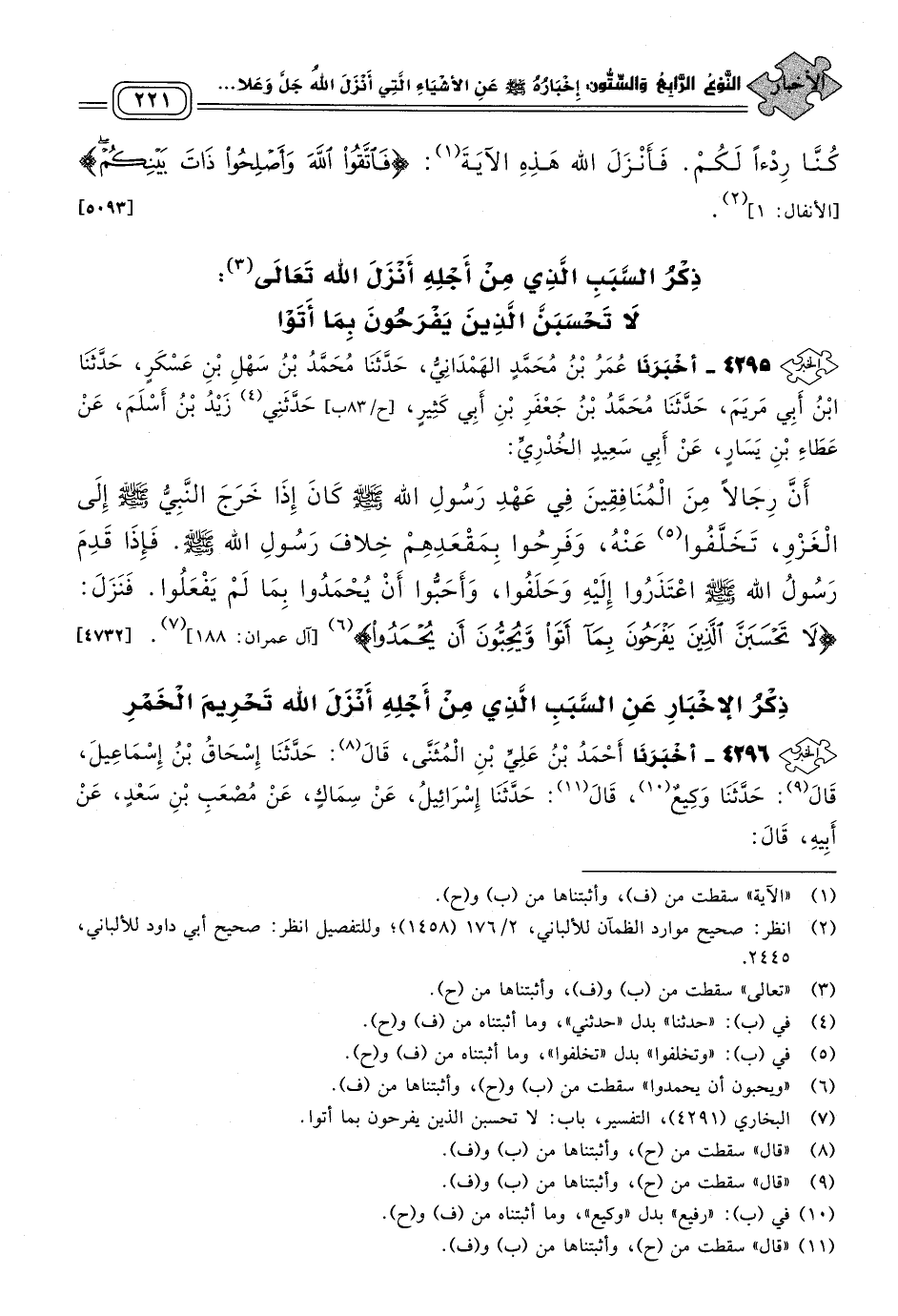 ٤٢٩٥ - أَخبَرنا عُمَرُ بْنُ مُحَمَّدٍ الْهَمْدَانِيُّ، حَدثنا مُحَمَّدُ بْنُ سَهْلِ بْنِ عَسْكَرٍ، حَدثنا ابْنُ أَبِي مَرْيَمَ، حَدثنا مُحَمَّدُ بْنُ جَعْفَرِ بْنِ أَبِي كَثِيرٍ، حَدثني زَيْدُ بْنُ أَسْلَمَ، عَنْ عَطَاءِ بْنِ يَسَارٍ، عَنْ أَبِي سَعِيدٍ الْخُدْرِيِّ، أَنَّ رِجَالاً مِنَ الْمُنَافِقِينَ فِي عَهْدِ رَسُولِ اللهِ صَلى الله عَلَيه وسَلم كَانَ إِذَا خَرَجَ النَّبِيُّ صَلى الله عَلَيه وسَلم إِلَى الْغَزْوِ تَخَلَّفُوا عَنْهُ وَفَرِحُوا بِمَقْعَدِهِمْ خِلَافَ رَسُولِ اللهِ صَلى الله عَلَيه وسَلم، فَإِذَا قَدِمَ رَسُولُ اللهِ صَلى الله عَلَيه وسَلم اعْتَذَرُوا إِلَيْهِ وَحَلَفُوا وَأَحَبُّوا أَنْ يُحْمَدُوا بِمَا لَمْ يَفْعَلُوا، فَنَزَلَ: {لَا تَحْسَبَنَّ الَّذِينَ يَفْرَحُونَ بِمَا أَتَوْا وَيُحِبُّونَ أَنْ يُحْمَدُوا} [آل عمران: ١٨٨]. [٤٧٣٢]