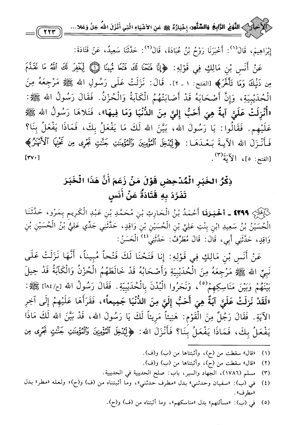٤٢٩٩ - أَخبَرنا أَحْمَدُ بْنُ الْحَارِث ِبْنِ مُحَمَّدِ بْنِ عَبْدِ الْكَرِيمِ بِمَرْوَ، حَدثنا الْحُسَيْنُ بْنُ سَعِيدِ ابْنِ بِنْتِ عَلِيِّ بْنِ الْحُسَيْنِ بْنِ وَاقِدٍ، حَدَّثَنِي جَدِّي عَلِيُّ بْنُ الْحُسَيْنِ بْنِ وَاقِدٍ، حَدَّثَنِي أَبِي، قَالَ: قَالَ مطرف: حَدَّثَنِي الْحَسَنُ، عَنْ أَنَسِ بْنِ مَالِكٍ فِي قَوْلِهِ: {إِنَّا فَتَحْنَا لَكَ فَتْحًا مُبِينًا} أَنَّهَا نَزَلَتْ عَلَى نَبِيِّ اللهِ صَلى الله عَلَيه وسَلم مَرْجِعَهُ مِنَ الْحُدَيْبِيَةِ وَأَصْحَابُهُ قَدْ خَالَطَهُمُ الْحُزْنُ وَالْكَآبَةُ، قَدْ حِيلَ بَيْنَهُمْ وَبَيْنَ مَناسكهِمْ، وَنَحَرُوا الْبُدْنَ بِالْحُدَيْبِيَةِ، فقَالَ رَسُولُ اللهِ صَلى الله عَلَيه وسَلم: "لَقَدْ نَزَلَتْ عَلَيَّ آيَةٌ هِيَ أَحَبُّ إِلَيَّ مِنَ الدُّنْيَا جَمِيعًا"، فَقَرَأَهَا عَلَيْهِمْ إِلَى آخِرِ الآيَةِ، فقَالَ رَجُلٌ مِنَ الْقَوْمِ: هَنِيئًا مَرِيئًا لَكَ يَا رَسُولَ اللهِ، قَدْ بَيَّنَ اللهُ لَكَ مَاذَا يَفْعَلُ بِكَ، فَمَاذَا يَفْعَلُ بِنَا؟ فَأَنْزَلَ اللهُ {لِيُدْخِلَ الْمُؤْمِنِينَ وَالْمُؤْمِنَاتِ جَنَّاتٍ تَجْرِي مِنْ تَحْتِهَا الأَنْهَارُ} [الفتح: ٥] إِلَى آخِرِ الآيَةِ. [٣٧١]