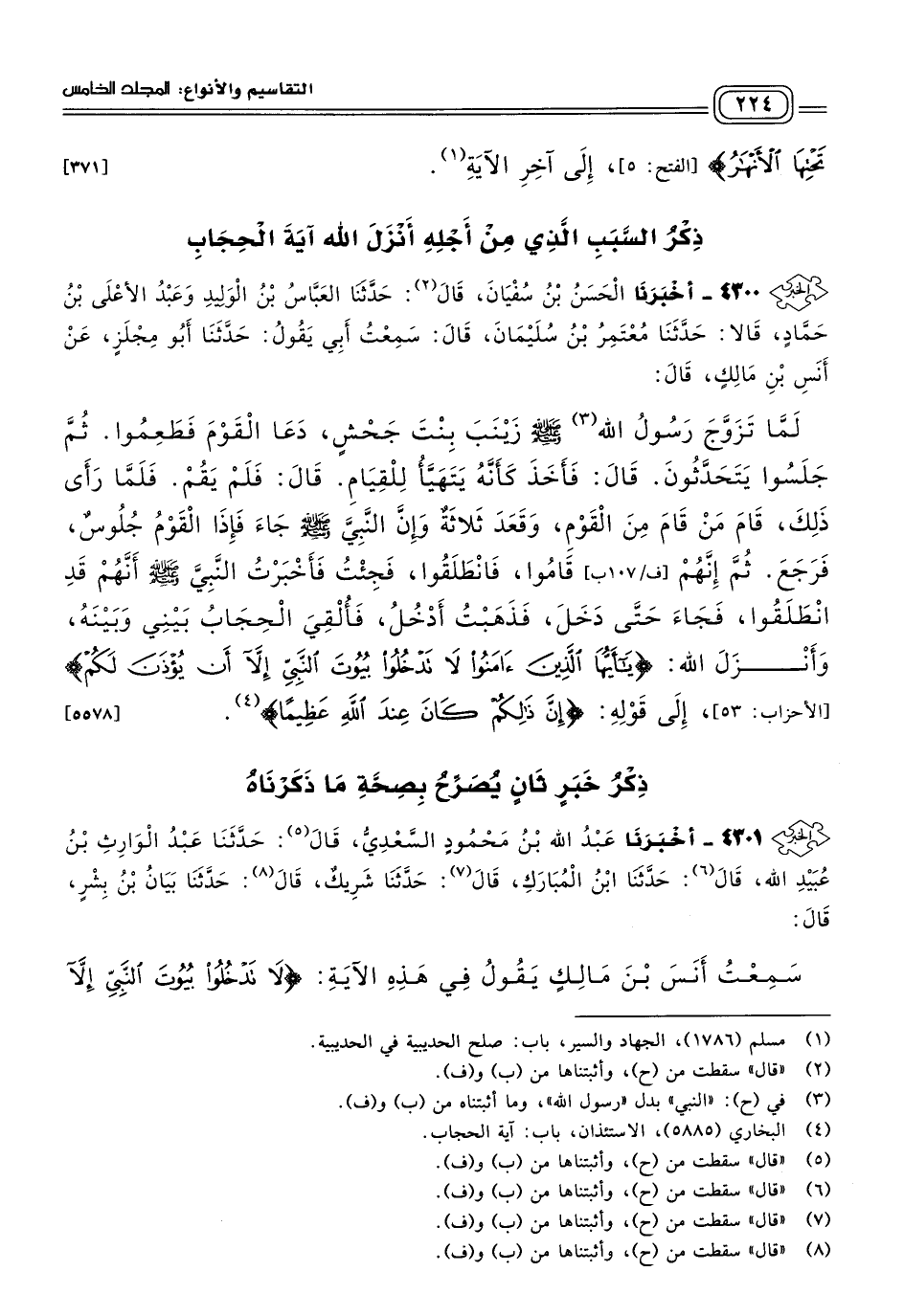 ذِكْرُ السَّبَبِ الَّذِي مِنْ أَجْلِهِ أَنْزَلَ اللهُ آيَةَ الْحِجَابِ.