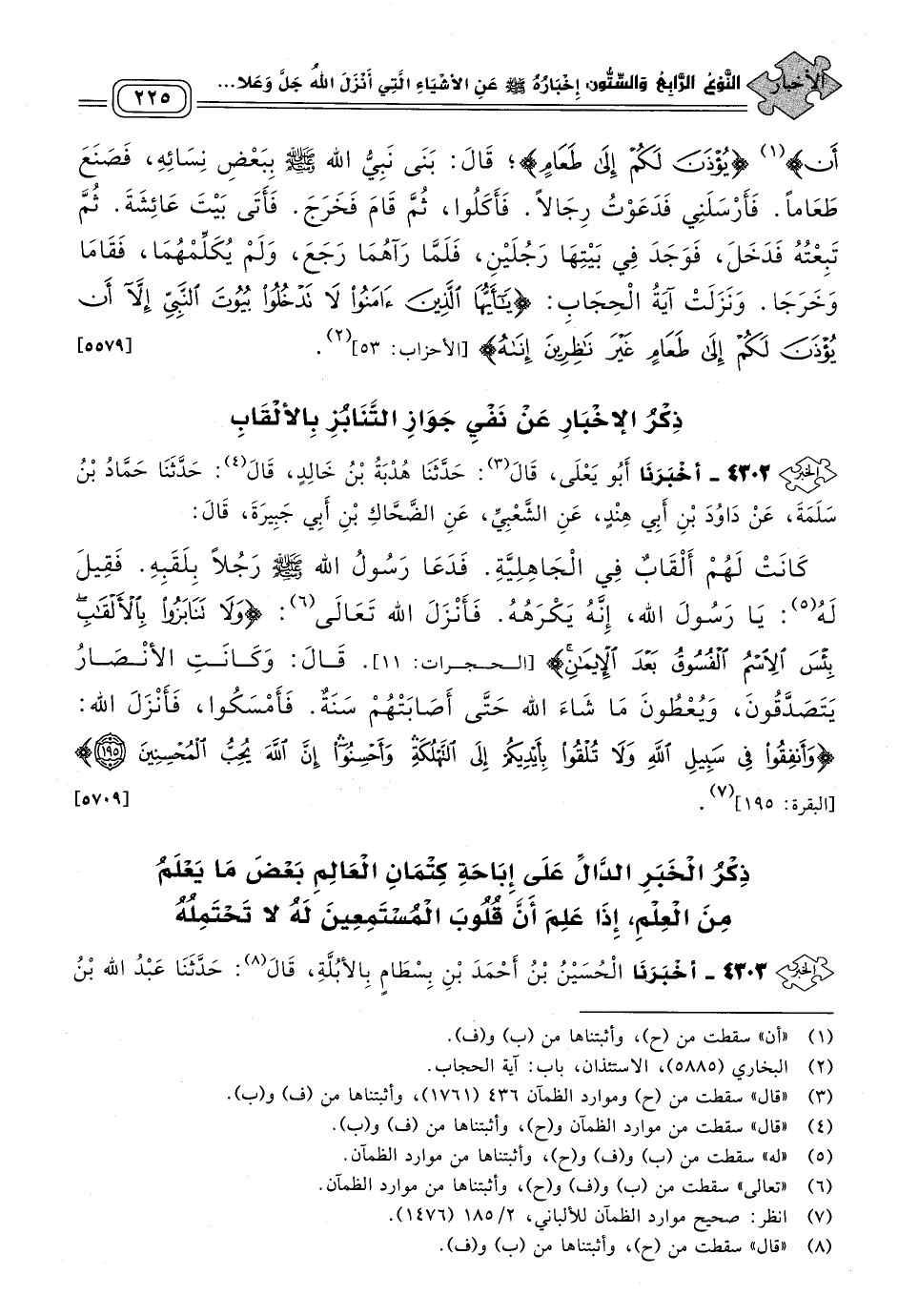 ٤٣٠٢ - أَخبَرنا أَبُو يَعْلَى، قَالَ: حَدثنا هُدْبَةُ بْنُ خَالِدٍ، قَالَ: حَدثنا حَمَّادُ بْنُ سَلَمَةَ، عَنْ دَاوُدَ بْنِ أَبِي هِنْدٍ، عَنِ الشَّعْبِيِّ، عَنِ الضَّحَّاكِ بْنِ أَبِي جَبِيرَةَ، قَالَ: كَانَتْ لَهُمْ أَلْقَابٌ فِي الْجَاهِلِيَّةِ، فَدَعَا رَسُولُ اللهِ صَلى الله عَلَيه وسَلم رَجُلاً بِلَقَبِهِ، فَقِيلَ له: يَا رَسُولَ اللهِ، إِنَّهُ يَكْرَهُهُ، فَأَنْزَلَ اللهُ تعالى: {وَلَا تَنَابَزُوا بِالأَلْقَابِ بِئْسَ الاِسْمُ الْفُسُوقُ بَعْدَ الإِيمَانِ} [الحجرات: ١١]، قَالَ: وَكَانَتِ الأَنْصَارُ يَتَصَدَّقُونَ وَيُعْطُونَ مَا شَاءَ اللهُ، حَتَّى أَصَابَتْهُمْ سَنَةٌ فَأَمْسَكُوا، فَأَنْزَلَ اللهُ: {وَأَنْفِقُوا فِي سَبِيلِ اللهِ وَلَا تُلْقُوا بِأَيْدِيكُمْ إِلَى التَّهْلُكَةِ وَأَحْسِنُوا إِنَّ اللهَ يُحِبُّ الْمُحْسِنِينَ} [البقرة: ١٩٥]. [٥٧٠٩]