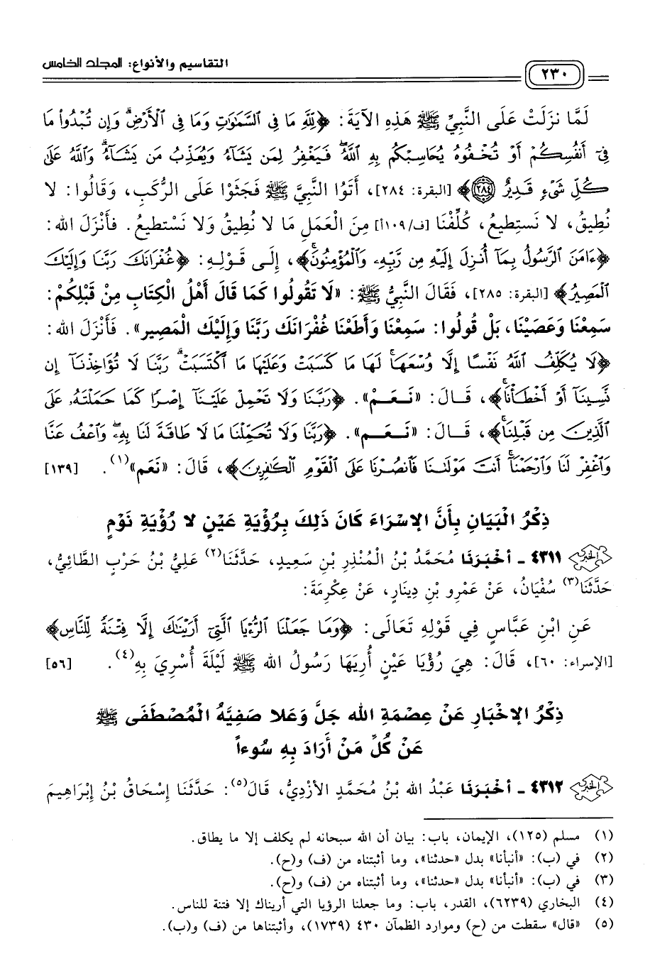 ٤٣١١ - أَخبَرنا مُحَمَّدُ بْنُ الْمُنْذِرِ بْنِ سَعِيدٍ، حدثنا عَلِيُّ بْنُ حَرْبٍ الطَّائِيُّ، حدثنا سُفْيَانُ، عَنْ عَمْرِو بْنِ دِينَارٍ، عَنْ عِكْرِمَةَ، عَنِ ابْنِ عَبَّاسٍ فِي قَوْلِهِ تَعَالَى: {وَمَا جَعَلْنَا الرُّؤْيَا الَّتِي أَرَيْنَاكَ إِلَاّ فِتْنَةً لِلنَّاسِ} [الإسراء: ٦٠]، قَالَ: هِيَ رُؤْيَا عَيْنٍ أُرِيَهَا رَسُولُ اللهِ صَلى الله عَلَيه وسَلم لَيْلَةَ أُسْرِيَ بِهِ. [٥٦]