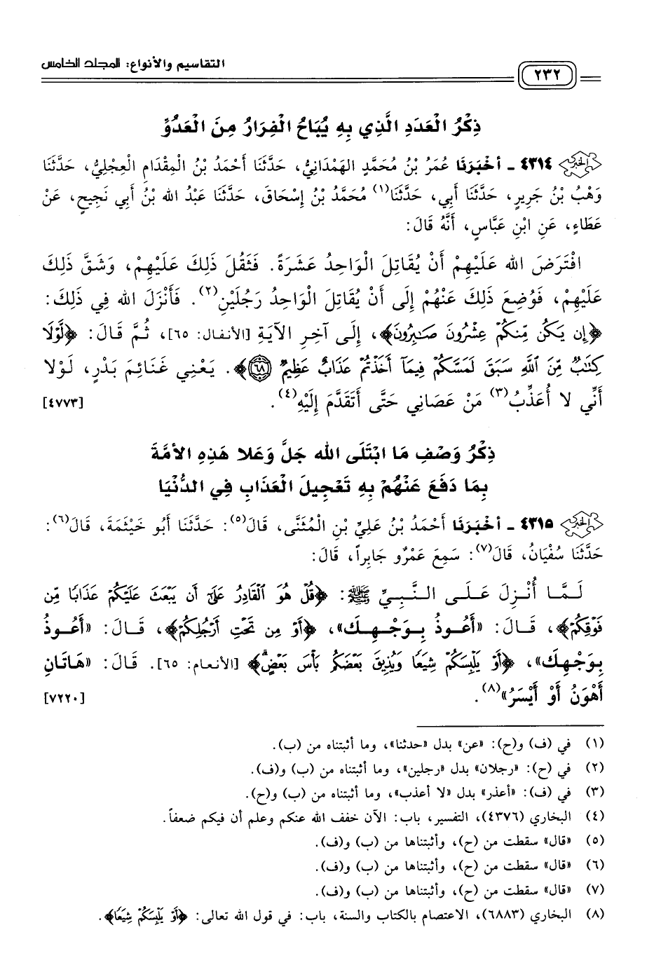 ٤٣١٤ - أَخبَرنا عُمَرُ بْنُ مُحَمَّدٍ الْهَمْدَانِيُّ، حَدثنا أَحْمَدُ بْنُ الْمِقْدَامِ الْعِجْلِيُّ، حَدثنا وَهْبُ بْنُ جَرِيرٍ، حَدثنا أَبِي، حَدثنا مُحَمَّدُ بْنُ إِسْحَاقَ، حَدثنا عَبْدُ اللهِ بْنُ أَبِي نَجِيحٍ، عَنْ عَطَاءٍ، عَنِ ابْنِ عَبَّاسٍ، أَنَّهُ قَالَ: افْتَرَضَ اللهُ عَلَيْهِمْ أَنْ يُقَاتِلَ الْوَاحِدُ عَشْرَةً، فَثَقُلَ ذَلِكَ عَلَيْهِمْ، وَشَقَّ ذَلِكَ عَلَيْهِمْ، فَوُضِعَ ذَلِكَ عَنْهُمْ إِلَى أَنْ يُقَاتِلَ الْوَاحِدُ رَجُلَيْنِ، فَأَنْزَلَ اللهُ فِي ذَلِكَ: {إِنْ يَكُنْ مِنْكُمْ عِشْرُونَ صَابِرُونَ} إِلَى آخِرِ الآيَةِ [الأنفال: ٦٥]، ثُمَّ قَالَ: {لَوْلَا كِتَابٌ مِنَ اللهِ سَبَقَ لَمَسَّكُمْ فِيمَا أَخَذْتُمْ عَذَابٌ عَظِيمٌ}، يَعْنِي غَنَائِمَ بَدْرٍ لَوْلَا أَنِّي لَا أُعَذِّبُ مَنْ عَصَانِي حَتَّى أَتَقَدَّمَ إِلَيْهِ. [٤٧٧٣]