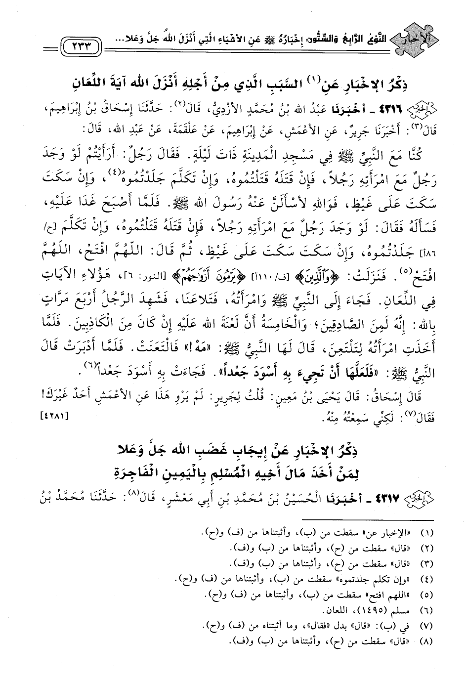 ٤٣١٦ - أَخبَرنا عَبْدُ اللهِ بْنُ مُحَمَّدٍ الأَزْدِيُّ، قَالَ: حَدثنا إِسْحَاقُ بْنُ إِبْرَاهِيمَ، قَالَ: أَخبَرنا جَرِيرٌ، عَنِ الأَعْمَشِ، عَنْ إِبْرَاهِيمَ، عَنْ عَلْقَمَةَ، عَنْ عَبْدِ اللهِ قَالَ: كُنَّا مَعَ النَّبِيِّ صَلى الله عَلَيه وسَلم فِي مَسْجِدِ الْمَدِينَةِ ذَاتَ لَيْلَةٍ، فَقَالَ رَجُلٌ: أَرَأَيْتُمْ لَوْ وَجَدَ رَجُلٌ مَعَ امْرَأَتِهِ رَجُلاً، فَإِنْ قَتَلَهُ قَتَلْتُمُوهُ، وَإِنْ تَكَلَّمَ جَلَدْتُمُوهُ، وَإِنْ سَكَتَ سَكَتَ عَلَى غَيْظٍ، فَوَاللهِ لأَسْأَلَنَّ عَنْهُ رَسُولَ اللهِ صَلى الله عَلَيه وسَلم، فَلَمَّا أَصْبَحَ غَدَا عَلَيْهِ فَسَأَلَهُ، فَقَالَ: لَوْ وَجَدَ رَجُلٌ مَعَ امْرَأَتِهِ رَجُلاً، فَإِنْ قَتَلَهُ قَتَلْتُمُوهُ، وَإِنْ تَكَلَّمَ جَلَدْتُمُوهُ، وَإِنْ سَكَتَ سَكَتَ عَلَى غَيْظٍ، ثُمَّ قَالَ: اللهُمَّ افْتَحْ، اللهُمَّ افْتَحْ، فَنَزَلَتْ: {وَالَّذِينَ يَرْمُونَ أَزْوَاجَهُمْ} [النور: ٦]، هَؤُلَاءِ الآيَاتِ فِي اللِّعَانِ، فَجَاءَ إِلَى النَّبِيِّ صَلى الله عَلَيه وسَلم وَامْرَأَتُهُ فَتَلَاعَنَا، فَشَهِدَ الرَّجُلُ أَرْبَعَ مَرَّاتٍ بِاللهِ إِنَّهُ لِمَنِ الصَّادِقِينَ، وَالْخَامِسَةُ أَنَّ لَعْنَةَ اللهِ عَلَيْهِ إِنْ كَانَ مِنَ الْكَاذِبِينَ، فَلَمَّا أَخَذَتِ امْرَأَتُهُ لِتَلْتَعِنَ، قَالَ لَهَا النَّبِيُّ صَلى الله عَلَيه وسَلم: "مَهْ"، فَالْتَعَنَتْ، فَلَمَّا أَدْبَرَتْ، قَالَ النَّبِيُّ صَلى الله عَلَيه وسَلم: "فَلَعَلَّهَا أَنْ تَجِيءَ بِهِ أَسْوَدَ جَعْدًا"، فَجَاءَتْ بِهِ أَسْوَدَ جَعْدًا.