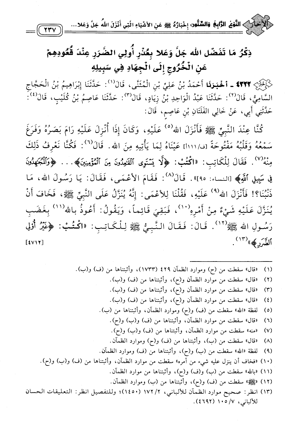 ٤٣٢٢ - أَخبَرنا أَحْمَدُ بْنُ عَلِيِّ بْنِ الْمُثَنَّى، قَالَ: حَدثنا إِبْرَاهِيمُ بْنُ الْحَجَّاجِ السَّامِيُّ، قَالَ: حَدثنا عَبْدُ الْوَاحِدِ بْنُ زِيَادٍ، قَالَ: حَدثنا عَاصِمُ بْنُ كُلَيْبٍ، قَالَ: حَدَّثَنِي أَبِي، عَنْ خَالِي الْفَلَتَانِ بْنِ عَاصِمٍ، قَالَ: كُنَّا عِنْدَ النَّبِيِّ صَلى الله عَلَيه وسَلم فَأَنْزَلَ اللهُ عَلَيْهِ، وَكَانَ إِذَا أُنْزِلَ عَلَيْهِ رَامَ بَصَرُهُ وَفَرَغَ سَمْعُهُ وَقَلْبُهُ، مَفْتُوحَةً عَيْنَاهُ لِمَا يَأْتِيهِ مِنَ اللهِ، قَالَ: فَكُنَّا نَعْرِفُ ذَلِكَ مِنْهُ، فَقَالَ لِلْكَاتِبِ: "اكْتُبْ: {لَا يَسْتَوِي الْقَاعِدُونَ مِنَ الْمُؤْمِنِينَ وَالْمُجَاهِدُونَ فِي سَبِيلِ اللهِ} "، قال: فَقَامَ الأَعْمَى، فَقَالَ: يَا رَسُولَ اللهِ، مَا ذَنْبُنَا؟ فَأَنْزَلَ اللهُ عَلَيْهِ، فَقُلْنَا لِلأَعْمَى: إِنَّهُ يُنَزَّلُ عَلَى النَّبِيِّ صَلى الله عَلَيه وسَلم، فَخَافَ أَنْ يُنَزَّلَ عَلَيْهِ شَيْءٌ مِنْ أَمْرِهِ، فَبَقِيَ قَائِمًا، وَيَقُولُ: أَعُوذُ بالله بِغَضَبِ رَسُولِ اللهِ صَلى الله عَلَيه وسَلم، قَالَ: فَقَالَ النَّبِيُّ صَلى الله عَلَيه وسَلم لِلْكَاتِبِ: "اكْتُبْ: {غَيْرُ أُولِي الضَّرَرِ} ". [٤٧١٢]