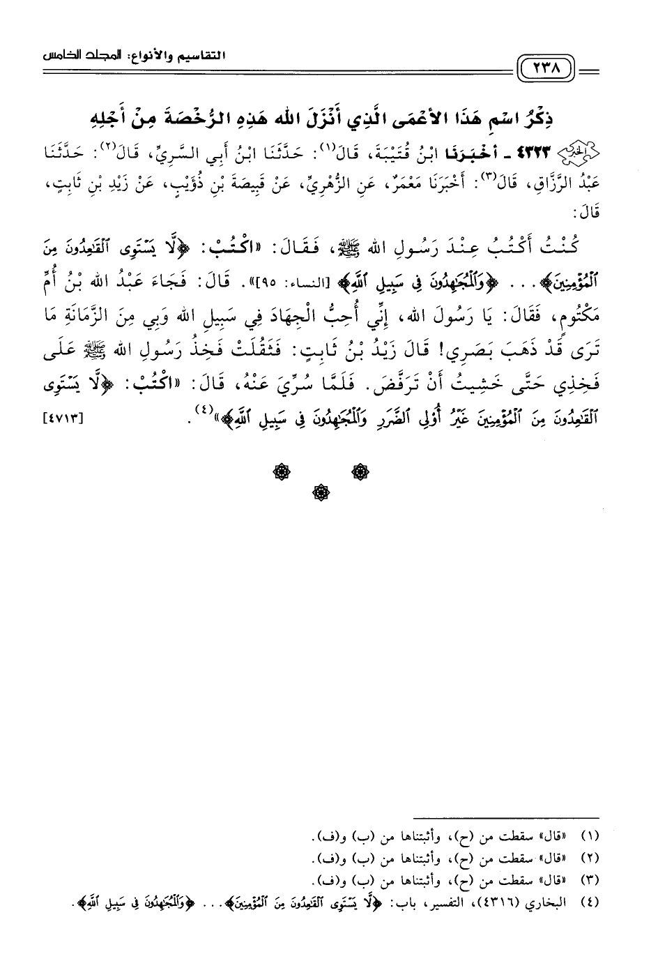 ٤٣٢٣ - أَخبَرنا ابْنُ قُتَيْبَةَ، قَالَ: حَدثنا ابْنُ أَبِي السَّرِيِّ، قَالَ: حَدثنا عَبْدُ الرَّزَّاقِ، قَالَ: أَخبَرنا مَعْمَرٌ، عَنِ الزُّهْرِيِّ، عَنْ قَبِيصَةَ بْنِ ذُؤَيْبٍ، عَنْ زَيْدِ بْنِ ثَابِتٍ، قَالَ: كُنْتُ أَكْتُبُ عِنْدَ رَسُولِ اللهِ صَلى الله عَلَيه وسَلم، فَقَالَ: "اكْتُبْ: {لَا يَسْتَوِي الْقَاعِدُونَ مِنَ الْمُؤْمِنِينَ وَالْمُجَاهِدُونَ فِي سَبِيلِ اللهِ} " قَالَ: فَجَاءَ عَبْدُ اللهِ بْنُ أُمِّ مَكْتُومٍ، فَقَالَ: يَا رَسُولَ اللهِ، إِنِّي أُحِبُّ الْجِهَادَ فِي سَبِيلِ اللهِ وَبِي مِنَ الزَّمَانَةِ مَا تَرَى قَدْ ذَهَبَ بَصَرِي، قَالَ زَيْدُ بْنُ ثَابِتٍ: فَثَقُلَتْ فَخِذُ رَسُولِ اللهِ صَلى الله عَلَيه وسَلم عَلَى فَخِذِي حَتَّى خَشِيتُ أَنْ تَرَفَّضَ، فَلَمَّا سُرِّيَ عَنْهُ قَالَ: "اكْتُبْ {لَا يَسْتَوِي الْقَاعِدُونَ مِنَ الْمُؤْمِنِينَ غَيْرُ أُولِي الضَّرَرِ وَالْمُجَاهِدُونَ فِي سَبِيلِ اللهِ} [النساء: ٩٥]. [٤٧١٣]