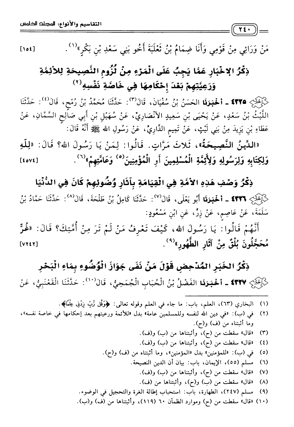 ذِكْرُ الإِخْبَارِ عَمَّا يَجِبُ عَلَى الْمَرْءِ مِنْ لُزُومِ النَّصِيحَةِ للأئمة ورعيتهم بعد إحكامها في خاصة نَفْسِهِ.