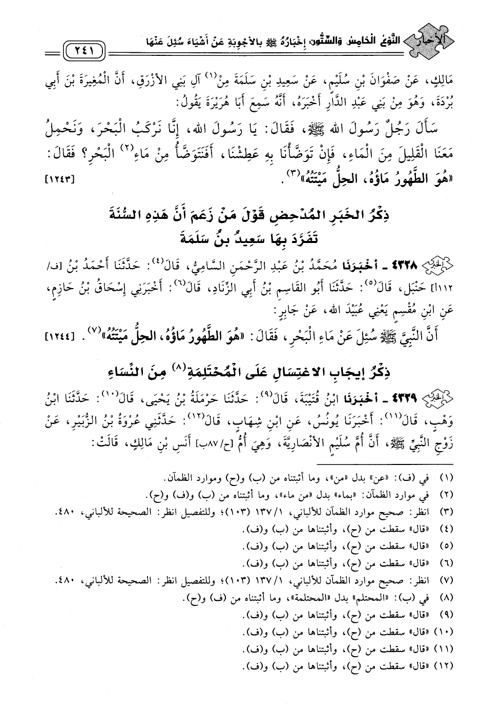 ٤٣٢٨ - أَخبَرنا مُحَمَّدُ بْنُ عَبْدِ الرَّحْمَنِ السَّامِيُّ، قَالَ: حَدثنا أَحْمَدُ بْنُ حَنْبَلٍ، قَالَ: حَدثنا أَبُو الْقَاسِمِ بْنُ أَبِي الزِّنَادِ، قَالَ: أَخْبَرَنِي إِسْحَاقُ بْنُ حَازِمٍ، عَنِ ابْنِ مِقْسَمٍ، يَعْنِي عُبَيْدَ اللهِ، عَنْ جَابِرٍ، أَنَّ النَّبِيَّ صَلى الله عَلَيه وسَلم سُئِلَ عَنْ مَاءِ الْبَحْرِ، فَقَالَ: "هُوَ الطَّهُورُ مَاؤُهُ، الْحِلُّ مَيْتَتُهُ". [١٢٤٤]
