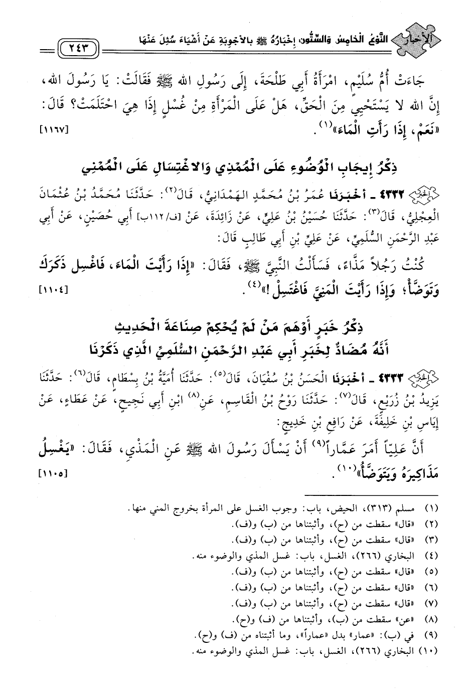 ٤٣٣٢ - أَخبَرنا عُمَرُ بْنُ مُحَمَّدٍ الْهَمْدَانِيُّ، قَالَ: حَدثنا مُحَمَّدُ بْنُ عُثْمَانَ الْعِجْلِيُّ، قَالَ: حَدثنا حُسَيْنُ بْنُ عَلِيٍّ، عَنْ زَائِدَةَ، عَنْ أَبِي حَصِينٍ، عَنْ أَبِي عَبْدِ الرَّحْمَنِ السُّلَمِيِّ، عَنْ عَلِيِّ بْنِ أَبِي طَالِبٍ قَالَ: كُنْتُ رَجُلاً مَذَّاءً، فَسَأَلْتُ النَّبِيَّ صَلى الله عَلَيه وسَلم، فَقَالَ: "إِذَا رَأَيْتَ الْمَاءَ فَاغْسِلْ ذَكَرَكَ وَتَوَضَّأْ، وَإِذَا رَأَيْتَ الْمَنِيَّ فَاغْتَسِلْ". [١١٠٤]