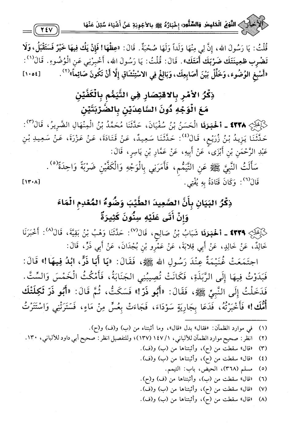٤٣٣٩ - أَخبَرنا شَبَابُ بْنُ صَالِحٍ، قَالَ: حَدثنا وَهْبُ بْنُ بَقِيَّةَ، قَالَ: أَخبَرنا خَالِدٌ، عَنْ خَالِدٍ، عَنْ أَبِي قِلَابَةَ، عَنْ عَمْرِو بْنِ بُجْدَانَ، عَنْ أَبِي ذَرٍّ، قَالَ: اجْتَمَعَتْ غُنَيْمَةٌ عِنْدَ رَسُولِ اللهِ صَلى الله عَلَيه وسَلم، فَقَالَ: "يَا أَبَا ذَرٍّ، ابْدُ فِيهَا"، قَالَ: فَبَدَوْتُ فِيهَا إِلَى الرَّبَذَةِ، فَكَانَتْ تُصِيبُنِي الْجَنَابَةُ، فَأَمْكُثُ الْخَمْسَ وَالسِّتَّ، فَدَخَلْتُ إِلَى النَّبِيِّ صَلى الله عَلَيه وسَلم، فَقَالَ: "أَبُو ذَرٍّ" فَسَكَتُّ، ثُمَّ قَالَ: "أَبُو ذَرٍّ، ثَكِلَتْكَ أُمُّكَ" فَأَخْبَرْتُهُ، فَدَعَا بِجَارِيَةٍ سَوْدَاءَ، فَجَاءَتْ بِعُسٍّ مِنْ مَاءٍ، فَسَتَرَتْنِي وَاسْتَتَرْتُ بِالرَّاحِلَةِ، فَاغْتَسَلْتُ فَكَأَنَّمَا أَلْقَيْتُ عَنِّي جَبَلاً، فَقَالَ صَلى الله عَلَيه وسَلم: "الصَّعِيدُ الطَّيِّبُ وَضُوءُ الْمُسْلِمِ وَلَوْ إِلَى عَشْرِ سِنِينَ، فَإِذَا وَجَدْتَ الْمَاءَ فَأَمْسِسْهُ جِلْدَكَ، فَإِنَّ ذَلِكَ خَيْرٌ". [١٣١١]