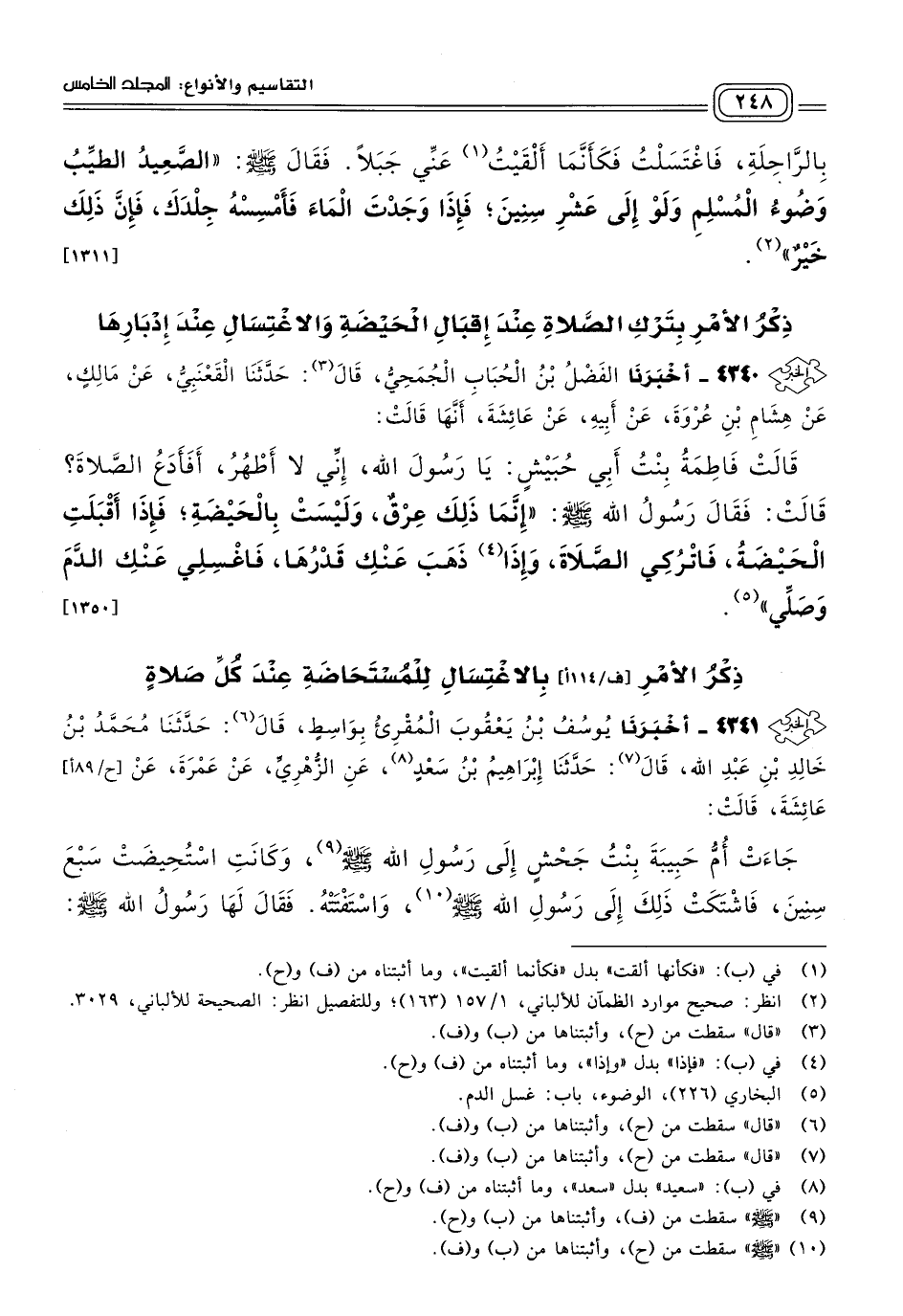 ٤٣٤١ - أَخبَرنا يُوسُفُ بْنُ يَعْقُوبَ الْمُقْرِئُ، بِوَاسِطَ، قَالَ: حَدثنا مُحَمَّدُ بْنُ خَالِدِ بْنِ عَبْدِ اللهِ، قَالَ: حَدثنا إِبْرَاهِيمُ بْنُ سَعْدٍ، عَنِ الزُّهْرِيِّ، عَنْ عَمْرَةَ، عَنْ عَائِشَةَ، قَالَتْ: جَاءَتْ أُمُّ حَبِيبَةَ بِنْتُ جَحْشٍ إِلَى رَسُولِ اللهِ صَلى الله عَلَيه وسَلم، وَكَانَتِ اسْتُحِيضَتْ سَبْعَ سِنِينَ، فَاشْتَكَتْ ذَلِكَ إِلَى رَسُولِ اللهِ صَلى الله عَلَيه وسَلم، وَاسْتَفْتَتْهُ، فَقَالَ لَهَا رَسُولُ اللهِ صَلى الله عَلَيه وسَلم: "إِنَّ هَذَا لَيْسَ بِحَيْضٍ، وَلَكِنْ هَذَا عِرْقٌ، فَاغْتَسِلِي، ثُمَّ صَلِّي"، قَالَتْ عَائِشَةُ: فَكَانَتْ أُمُّ حَبِيبَةَ تَغْتَسِلُ لِكُلِّ صَلَاةٍ، فَكَانَتْ تَجْلِسُ فِي الْمِرْكَنِ فَتَعْلُو حُمْرَةُ الدَّمِ الْمَاءَ، ثُمَّ تُصَلِّي. [١٣٥١]