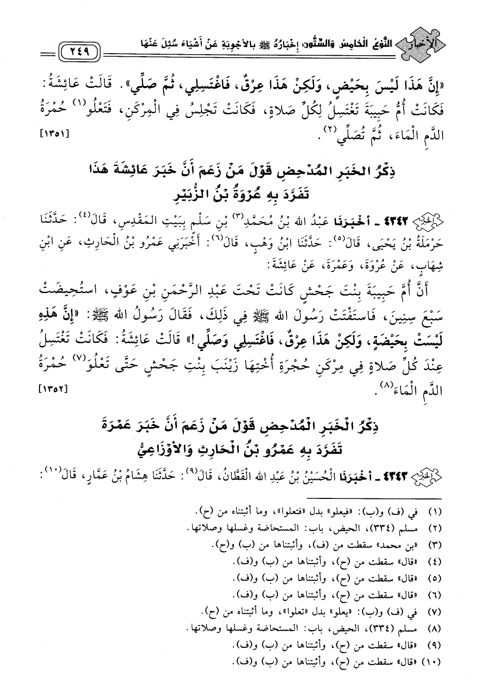٤٣٤٢ - أَخبَرنا عَبْدُ اللهِ بْنُ مُحَمَّدِ بْنِ سَلْمٍ، بِبَيْتِ الْمَقْدِسِ، قَالَ: حَدثنا حَرْمَلَةُ بْنُ يَحْيَى، قَالَ: حَدثنا ابْنُ وَهْبٍ، قَالَ: أَخْبَرَنِي عَمْرُو بْنُ الْحَارِثِ، عَنِ ابْنِ شِهَابٍ، عَنْ عُرْوَةَ، وَعُمْرَةَ، عَنْ عَائِشَةَ، أَنَّ أُمَّ حَبِيبَةَ بِنْتَ جَحْشٍ كَانَتْ تَحْتَ عَبْدِ الرَّحْمَنِ بْنِ عَوْفٍ، اسْتُحِيضَتْ سَبْعَ سِنِينَ، فَاسْتَفْتَتْ رَسُولَ اللهِ صَلى الله عَلَيه وسَلم فِي ذَلِكَ، فَقَالَ رَسُولُ اللهِ صَلى الله عَلَيه وسَلم: "إِنَّ هَذِهِ لَيْسَتْ بِحَيْضَةٍ، وَلَكِنْ هَذَا عِرْقٌ، فَاغْتَسِلِي وَصَلِّي"، قَالَتْ عَائِشَةُ: فَكَانَتْ تَغْتَسِلُ عِنْدَ كُلِّ صَلَاةٍ فِي مِرْكَنِ حُجْرَةِ أُخْتِهَا زَيْنَبَ بِنْتِ جَحْشٍ حَتَّى تَعْلُوَ حُمْرَةُ الدَّمِ الْمَاءَ. [١٣٥٢]