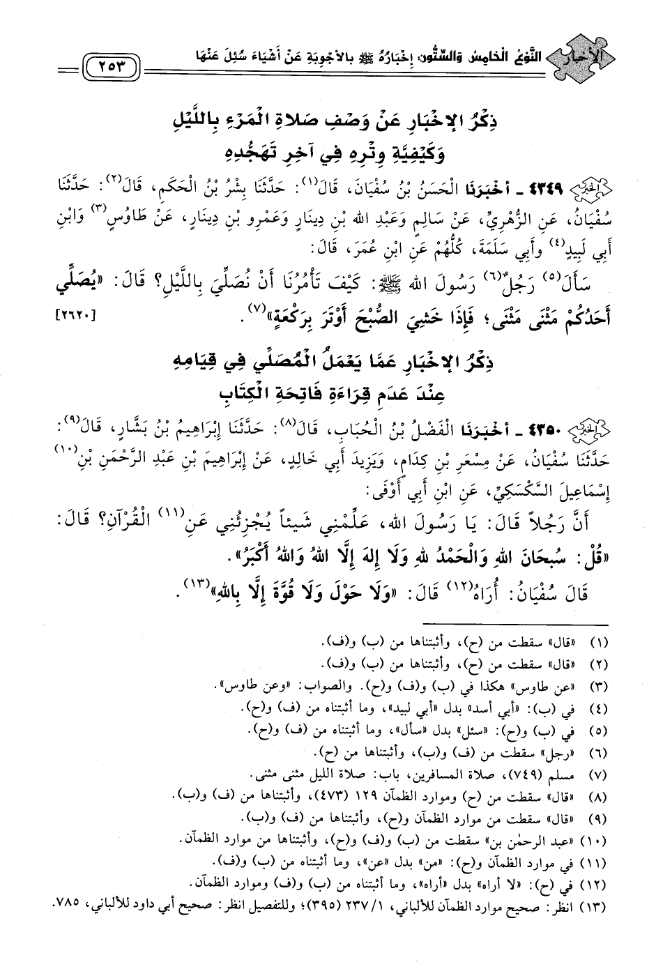 ٤٣٤٩ - أَخبَرنا الْحَسَنُ بْنُ سُفْيَانَ، قَالَ: حَدثنا بِشْرُ بْنُ الْحَكَمِ، قَالَ: حَدثنا سُفْيَانُ، عَنِ الزُّهْرِيِّ، عَنْ سَالِمٍ، وَعَبْدِ اللهِ بْنِ دِينَارٍ، وَعَمْرِو بْنِ دِينَارٍ، عَنْ طَاوُسٍ، وَابْنِ أَبِي لَبِيدٍ، وَأَبِي سَلَمَةَ، كُلُّهُمْ عَنِ ابْنِ عُمَرَ، قَالَ: سَأَلَ رَجُلٌ رَسُولَ اللهِ صَلى الله عَلَيه وسَلم: كَيْفَ تَأْمُرُنَا أَنْ نُصَلِّيَ بِاللَّيْلِ؟ قَالَ: "يُصَلِّي أَحَدُكُمْ مَثْنَى مَثْنَى، فَإِذَا خَشِيَ الصُّبْحَ أَوْتَرَ بِرَكْعَةٍ". [٢٦٢٠]