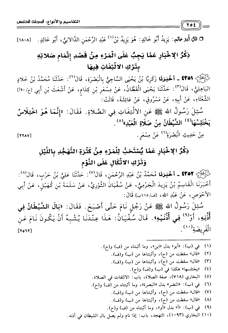 ٤٣٥٢ - أَخبَرنا مُحَمَّدُ بْنُ عَبْدِ الرَّحْمَنِ، قَالَ: حَدثنا عَلِيُّ بْنُ حَرْبٍ، قَالَ: أَخبَرنا الْقَاسِمُ بْنُ يَزِيدَ الْجَرْمِيُّ، عَنْ سُفْيَانَ الثَّوْرِيِّ، عَنْ سَلَمَةَ بْنِ كُهَيْلٍ، عَنْ أَبِي الأَحْوَصِ، عَنْ عَبْدِ اللهِ قَالَ: سُئِلَ رَسُولُ اللهِ صَلى الله عَلَيه وسَلم عَنْ رَجُلٍ نَامَ حَتَّى أَصْبَحَ، فَقَالَ: "بَالَ الشَّيْطَانُ فِي أُذُنِهِ، أَوْ فِي أُذُنَيْهِ"، قَالَ سُفْيَانُ: هَذَا عِنْدَنَا يُشْبِهُ أَنْ يَكُونَ نَامَ عَنِ الْفَرِيضَةِ. [٢٥٦٢]