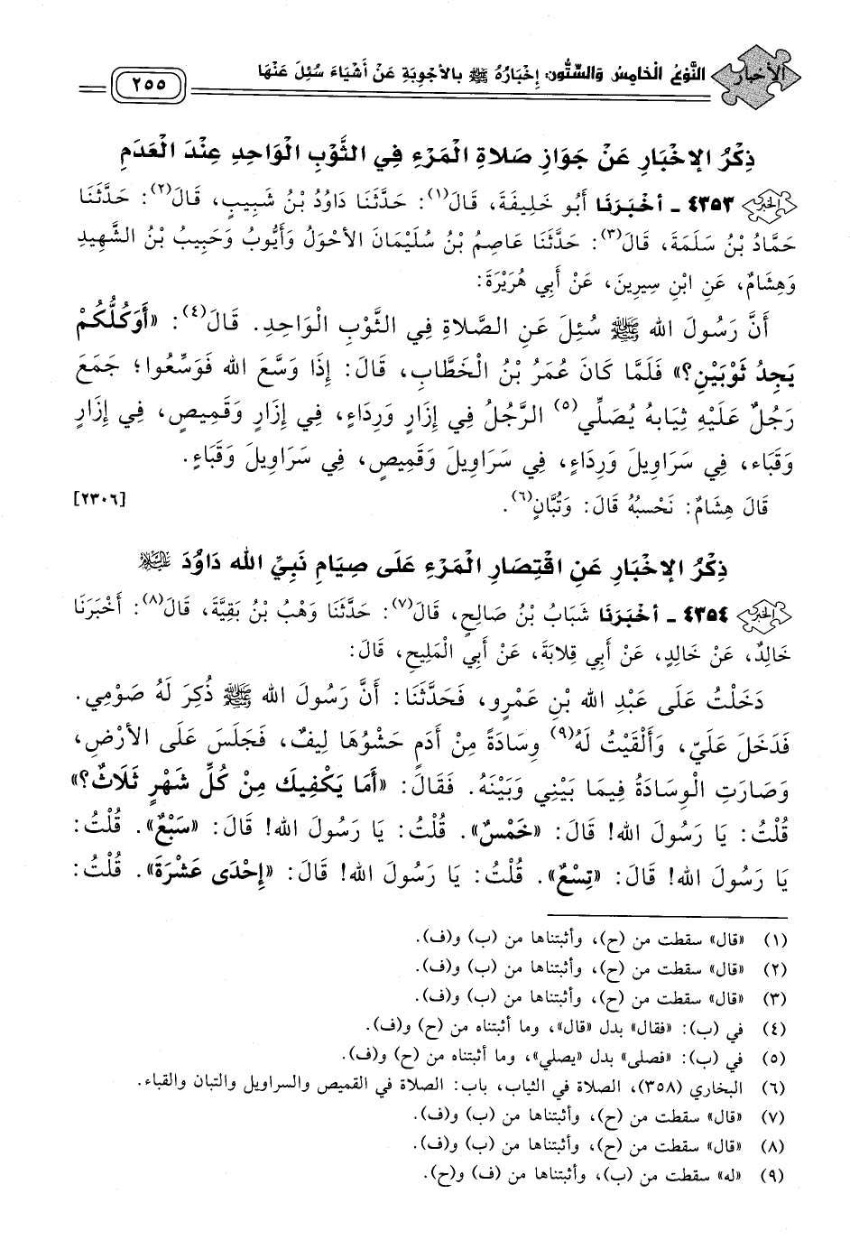 ٤٣٥٣ - أَخبَرنا أَبُو خَلِيفَةَ، قَالَ: حَدثنا دَاوُدُ بْنُ شَبِيبٍ، قَالَ: حَدثنا حَمَّادُ بْنُ سَلَمَةَ، قَالَ: حَدثنا عَاصِمُ بْنُ سُلَيْمَانَ الأَحْوَلُ، وَأَيُّوبُ، وَحَبِيبُ بْنُ الشَّهِيدِ، وَهِشَامٌ، عَنِ ابْنِ سِيرِينَ، عَنْ أَبِي هُرَيْرَةَ، أَنَّ رَسُولَ اللهِ صَلى الله عَلَيه وسَلم سُئِلَ عَنِ الصَّلَاةِ فِي الثَّوْبِ الْوَاحِدِ، قَالَ: "أَوَكُلُّكُمْ يَجِدُ ثَوْبَيْنِ؟ ".