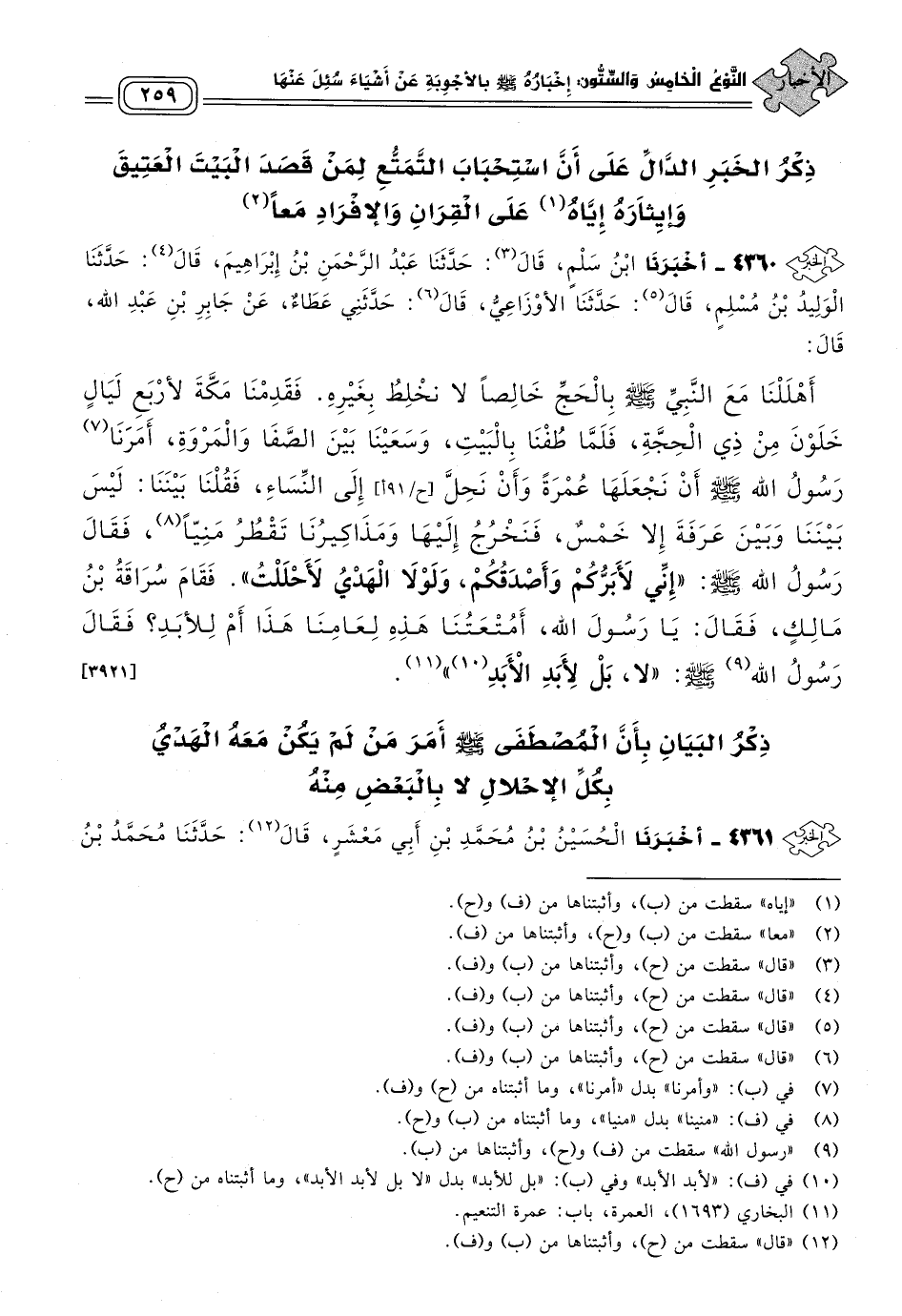 ٤٣٦١ - أَخبَرنا الْحُسَيْنُ بْنُ مُحَمَّدِ بْنِ أَبِي مَعْشَرٍ، قَالَ: حَدثنا مُحَمَّدُ بْنُ وهب بن أبي كريمة، قَالَ: حَدثنا مُحَمَّدُ بْنُ سَلَمَةَ، عَنْ أَبِي عَبْدِ الرَّحِيمِ، عَنْ زَيْدِ بْنِ أَبِي أُنَيْسَةَ، عَنْ أَبِي الزُّبَيْرِ، عَنْ جَابِرٍ قَالَ: خَرَجْنَا مَعَ النَّبِيِّ صَلى الله عَلَيه وسَلم مُهِلِّينَ بِالْحَجِّ، فَقَدِمْنَا مَكَّةَ، فَطُفْنَا بِالْبَيْتِ، وَبَيْنَ الصَّفَا وَالْمَرْوَةِ، ثُمَّ قَامَ فِينَا النَّبِيُّ صَلى الله عَلَيه وسَلم، فَقَالَ: "مَنْ لَمْ يَكُنْ مِنْكُمْ سَاقَ هَدْيًا فَلْيَحْلِلْ وَلْيَجْعَلْهَا عُمْرَةً"، فَقُلْنَا: حِلٌّ مَاذَا يَا رَسُولَ اللهِ؟ قَالَ: "الْحِلُّ كُلُّهُ"، فَوَاقَعْنَا النِّسَاءَ، وَلَبِسْنَا الثياب، وَتَطَيَّبْنَا بِالطِّيبِ، فَقَالَ أُنَاسٌ: مَا هَذَا الأَمْرُ؟ نَأْتِي عَرَفَةَ وَأُيُورُنَا تَقْطُرُ مَنِيًّا؟ فَبَلَغَ ذَلِكَ النَّبِيَّ صَلى الله عَلَيه وسَلم، فَقَامَ فِينَا كَالْمُغْضَبِ، فَقَالَ: "وَاللهِ لَقَدْ عَلِمْتُمْ أَنِّي أَتْقَاكُمْ، وَلَوْ عَلِمْتُ أَنَّكُمْ تَقُولُونَ هَذَا مَا سُقْتُ الْهَدْيَ، فَاسْمَحُوا بِمَا تُأْمَرُونَ بِهِ"، فَقَامَ سُرَاقَةُ بْنُ مَالِكِ بْنِ جُعْشُمٍ، فَقَالَ: يَا رَسُولَ اللهِ، عُمْرَتُنَا هَذِهِ الَّتِي أَمَرْتَنَا بِهَا أَلِعَامِنَا هَذَا أَمْ لِلأَبَدِ؟ فَقَالَ النَّبِيُّ صَلى الله عَلَيه وسَلم: "بَلْ لِلأَبَدِ". [٣٩٢٤]